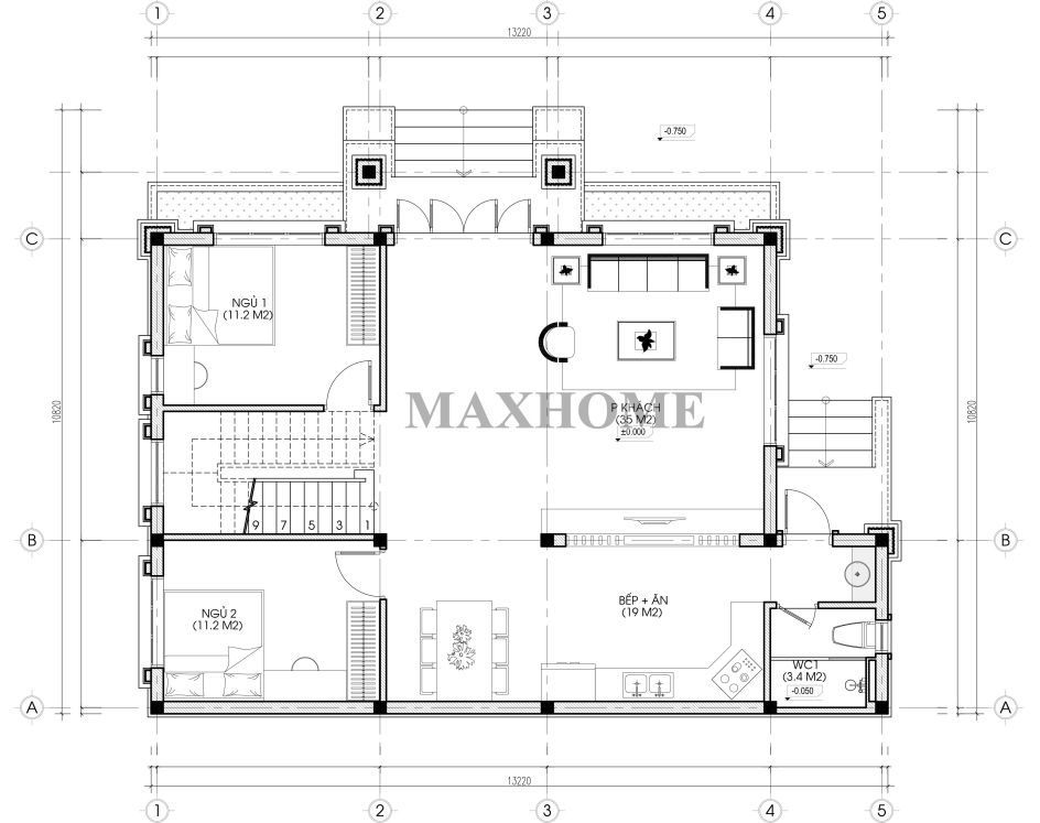 Công trình có kích thước xây dựng 13,2 x 10,8m, tổng diện tích sử dụng khoảng 202m², được quy hoạch công năng hợp lý giữa các khu vực chung và riêng, tạo sự liên kết chặt chẽ mà vẫn đảm bảo tính riêng tư.
