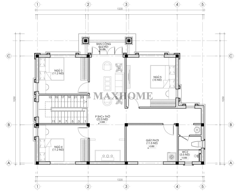 Không gian thờ cúng trang nghiêm cùng phòng sinh hoạt chung được bố trí trên tầng 2, kết hợp ban công đón gió mát giúp tăng sinh khí và thu hút tài lộc cho gia chủ. Ban công cũng được tận dụng làm góc thư giãn yên tĩnh, nơi gia chủ có thể ngồi thưởng trà, ngắm cảnh và tận hưởng không khí trong lành. Ngoài ra, tầng 2 còn có 3 phòng ngủ cùng 1 nhà vệ sinh chung đáp ứng đầy đủ nhu cầu sinh hoạt của gia đình một cách tiện nghi và thoải mái.