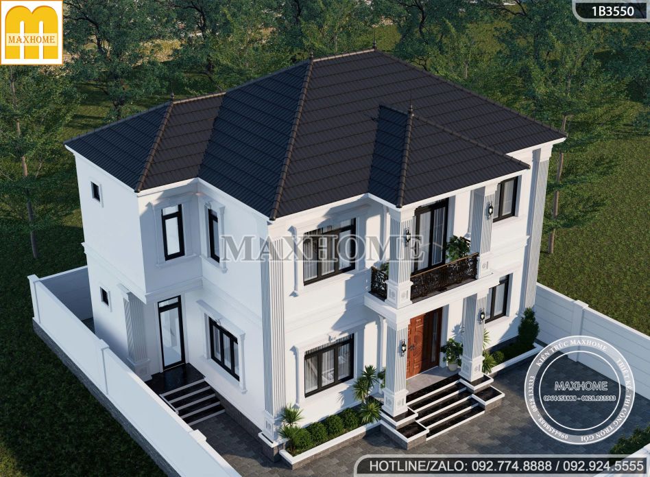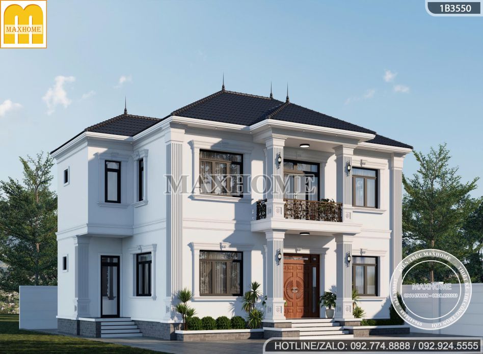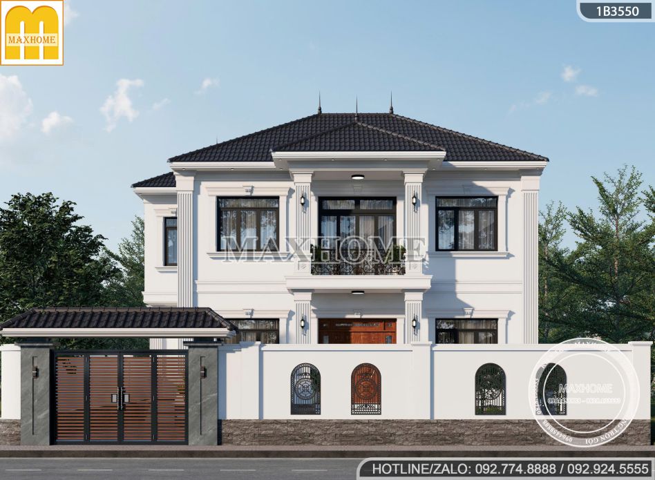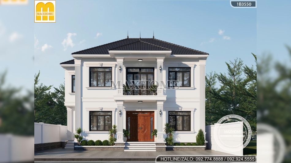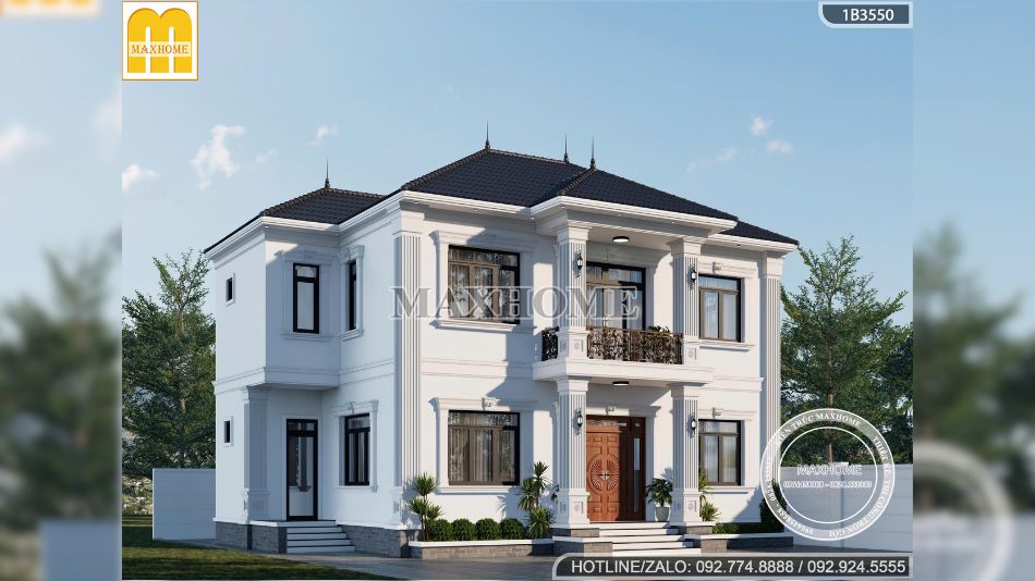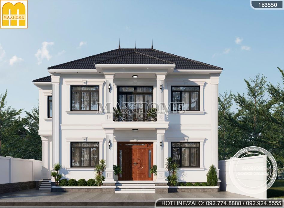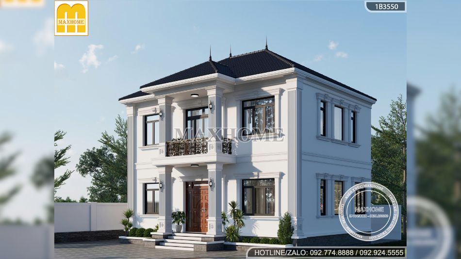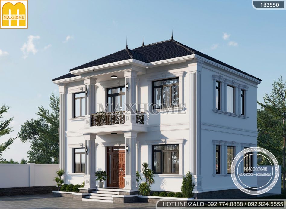 Điểm gây ấn tượng mạnh mẽ ngay từ cái nhìn đầu tiên chính là hình khối kiến trúc vững chãi nhưng vẫn toát lên sự thanh thoát. Công trình được thiết kế đối xứng với hệ cột lớn mang phong cách tân cổ điển nhẹ nhàng, tạo nên vẻ sang trọng, kiêu hãnh mà không hề nặng nề. Các chi tiết phào chỉ chạy dọc theo thân cột và viền mái được xử lý tinh xảo, góp phần tôn lên sự bề thế cho ngoại thất. Nhìn tổng thể, mẫu nhà 2 tầng mái Nhật hiện lên như một khối kiến trúc hài hòa, cân xứng, mang trong mình sự tinh gọn mà vẫn đậm chất quyền quý.