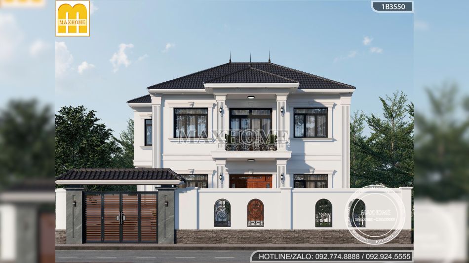 Màu sắc tổng thể của ngôi nhà được phối hợp khéo léo. Gam trắng chủ đạo bao phủ ngoại thất, mang đến cảm giác thanh lịch, tinh khiết, đồng thời làm nổi bật sự sang trọng của những chi tiết phào chỉ, lan can sắt nghệ thuật và hệ mái ngói xanh than. Sự kết hợp tinh tế này tạo nên hiệu ứng thị giác mạnh mẽ, khiến công trình vừa hiện đại, vừa cổ điển, vừa trang nhã mà không kém phần nổi bật.