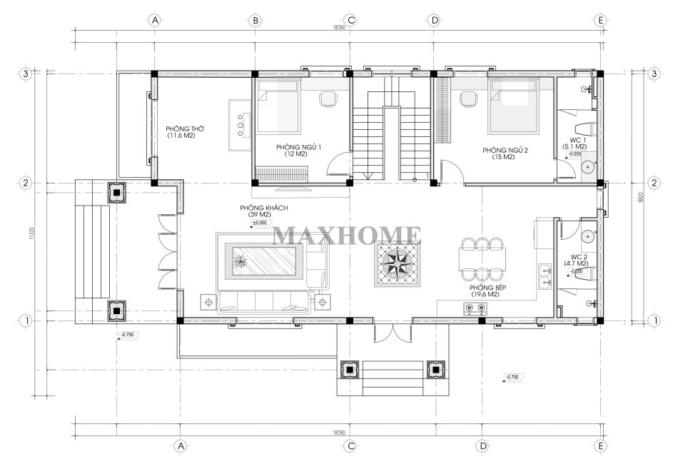 Tiếp nối trục giao thông là khu bếp – ăn ấm cúng, thiết kế mở hướng ra sảnh phụ giúp tăng khả năng lấy sáng, đón gió và giữ cho không gian sinh hoạt luôn thông thoáng. Tầng 1 còn sở hữu 2 phòng ngủ tiện nghi, trong đó 1 phòng có vệ sinh khép kín phù hợp cho ông bà nghỉ ngơi thoải mái, 1 phòng dành cho khách cùng nhà vệ sinh chung bố trí hợp lý, thuận tiện cho mọi thành viên.