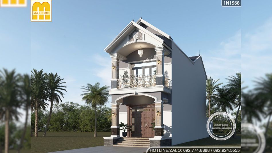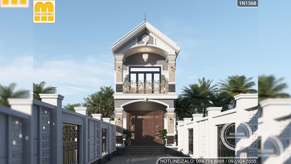 Ngay từ mặt tiền, ngôi nhà đã thể hiện rõ phong cách tân cổ điển được Maxhome chăm chút tỉ mỉ. Đây là mẫu nhà phố 2 tầng mái Thái điển hình với chiều ngang 5,4m nhưng lại được xử lí thông minh để trở nên thoáng mắt và sang trọng hơn nhiều. Công trình không sử dụng quá nhiều những chi tiết quá cầu kì mà rất vừa phải để phù hợp với phong cách tân cổ kiêu hãnh nhờ sự cân đối và cách phối màu tinh tế.