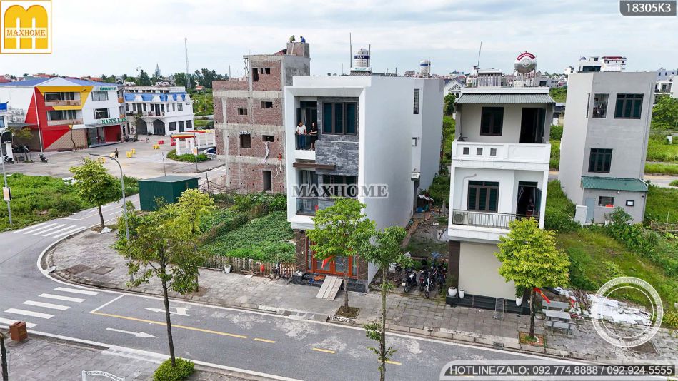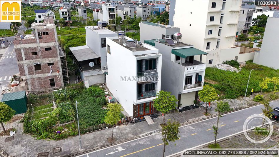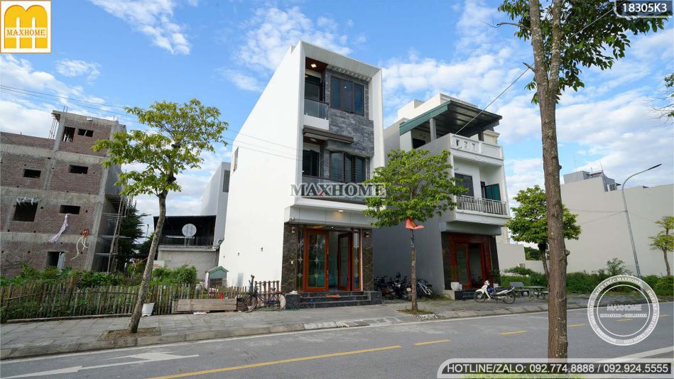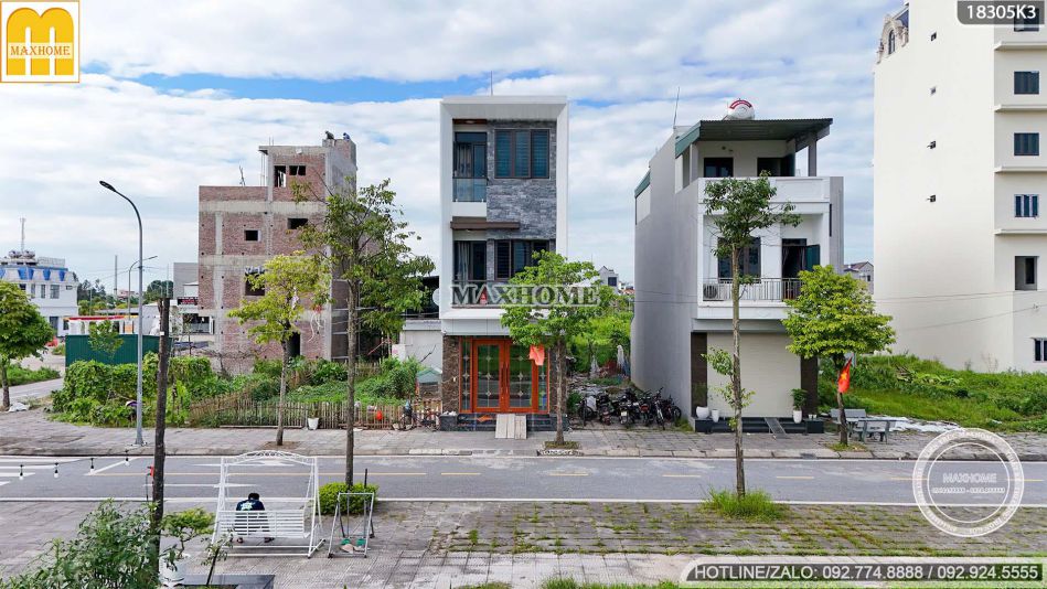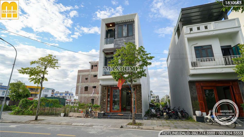 Ngôi nhà 3 tầng thực tế được Maxhome thiết kế với mặt tiền rộng 4,5m, mang đậm dấu ấn hiện đại và tinh tế. Kiến trúc tổng thể được tạo hình theo khối vuông vắn, chắc chắn, vừa đảm bảo tính thẩm mỹ vừa tối ưu không gian sử dụng trên diện tích đất hạn chế.