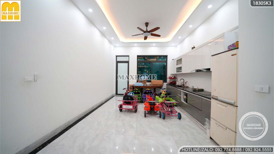 Vì gia chủ của ngôi nhà phố 3 tầng này có kinh doanh dịch vụ cho thuê xe điện, nên không gian tầng 1 được tận dụng chủ yếu làm khu vực để xe. Kiến trúc sư đã thiết kế mặt bằng tầng này theo hướng rộng rãi, thông thoáng và thuận tiện cho việc di chuyển, đỗ xe, đồng thời vẫn đảm bảo tính thẩm mỹ và an toàn cho toàn bộ công trình. Cách bố trí này không chỉ đáp ứng nhu cầu kinh doanh của gia chủ mà còn giúp phân tách rõ ràng giữa khu vực sinh hoạt và khu vực dịch vụ, mang lại sự tiện nghi và khoa học trong sử dụng.