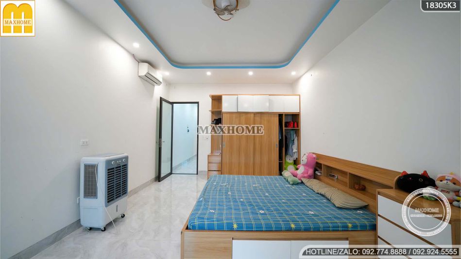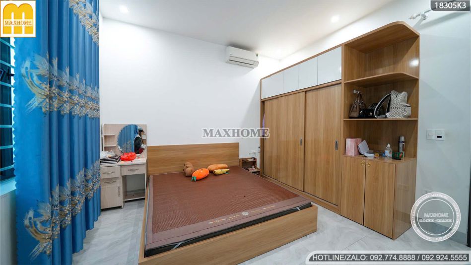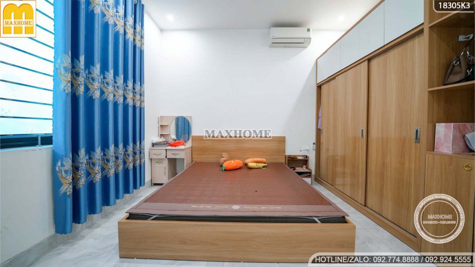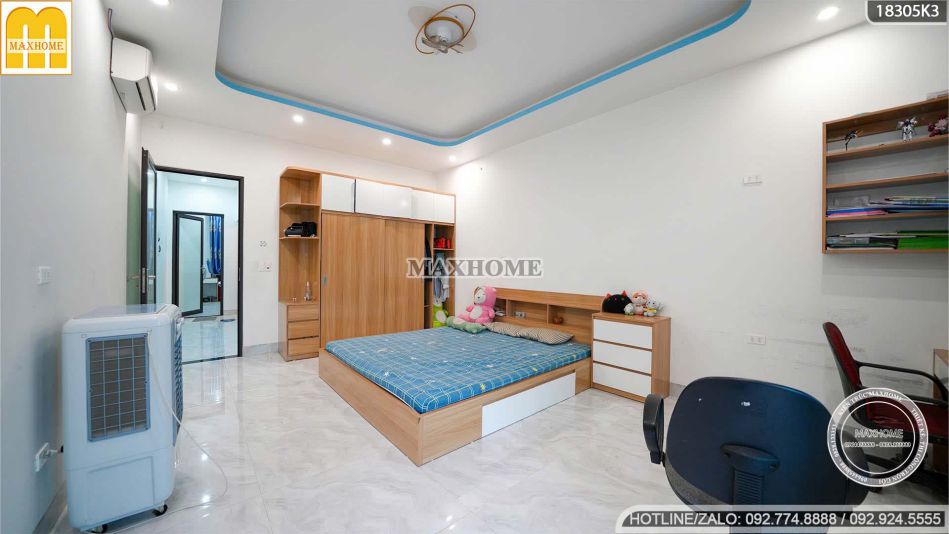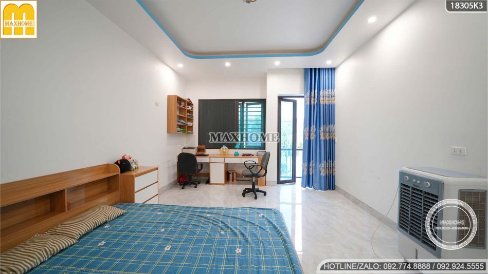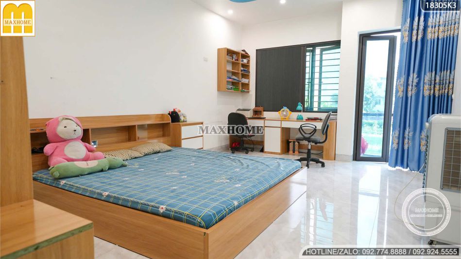Phòng ngủ được bố trí đầy đủ nội thất cơ bản gồm giường ngủ êm ái, tab đầu giường, bàn học hoặc bàn làm việc, tủ quần áo rộng rãi giúp tối ưu công năng sử dụng. Từng món đồ nội thất đều được lựa chọn kỹ lưỡng về chất liệu, màu sắc và kiểu dáng, đảm bảo sự hài hòa với tổng thể kiến trúc của ngôi nhà. Không gian phòng ngủ còn được bố trí hợp lý về ánh sáng và thông gió, mang đến cảm giác thư giãn, thoải mái, giúp các thành viên có được những giây phút nghỉ ngơi trọn vẹn nhất sau một ngày dài làm việc.