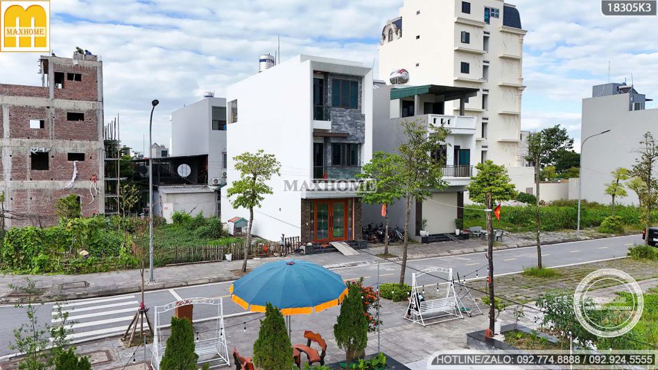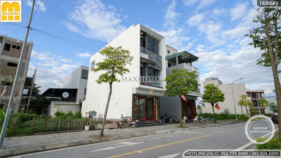 Điểm nhấn nổi bật của công trình đến từ cách xử lý hình khối và tỷ lệ kiến trúc khéo léo, kết hợp giữa các mảng tường, ban công và vật liệu trang trí một cách hài hòa. Nhờ đó, ngôi nhà không chỉ toát lên vẻ đẹp cân đối, sang trọng mà còn thể hiện phong cách sống năng động, hiện đại – một lựa chọn lý tưởng giữa lòng đô thị.
