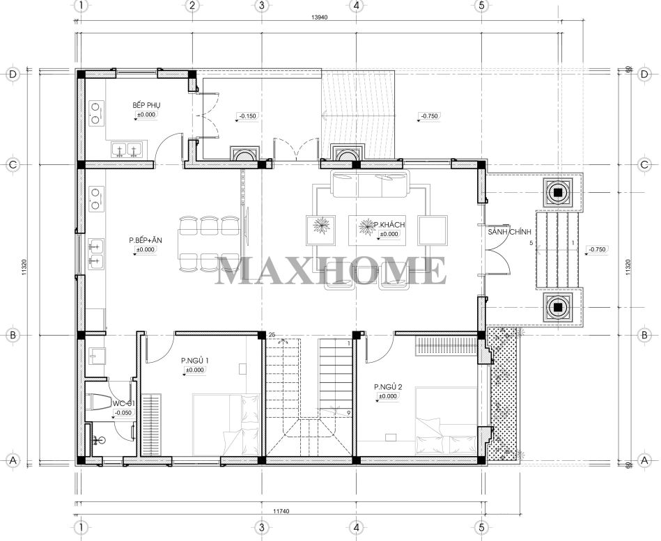 Ngoài khu bếp chính, công trình còn bố trí thêm một không gian bếp phụ riêng biệt, phù hợp cho việc nấu nướng thường xuyên hoặc chế biến các món ăn có mùi, góp phần giữ cho khu vực sinh hoạt chung luôn sạch sẽ và gọn gàng. Tầng này còn có 2 phòng ngủ được sắp xếp hợp lý, đảm bảo sự riêng tư và yên tĩnh. Cuối nhà là 1 phòng vệ sinh chung, đặt tại vị trí thuận tiện cho việc sử dụng mà vẫn đảm bảo tính kín đáo và thẩm mỹ cho tổng thể mặt bằng.
