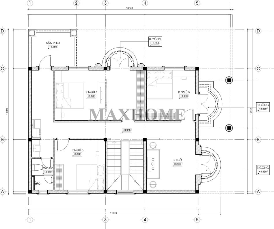 • Tầng 2: Phòng thờ, 3 phòng ngủ, 1 wc