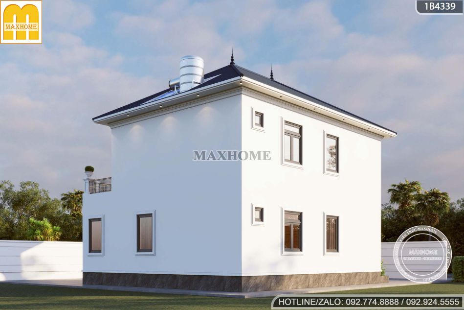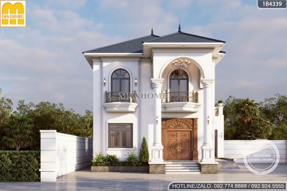 Mẫu nhà 2 tầng mái Nhật mang phong cách tân cổ điển được thiết kế ban công nổi bật với hình dáng bán nguyệt mềm mại, tạo điểm nhấn uyển chuyển cho mặt tiền. Kiểu dáng cong nhẹ không chỉ tăng tính thẩm mỹ mà còn giúp tổng thể kiến trúc trở nên thanh thoát và cân đối hơn.