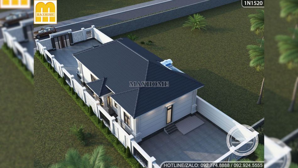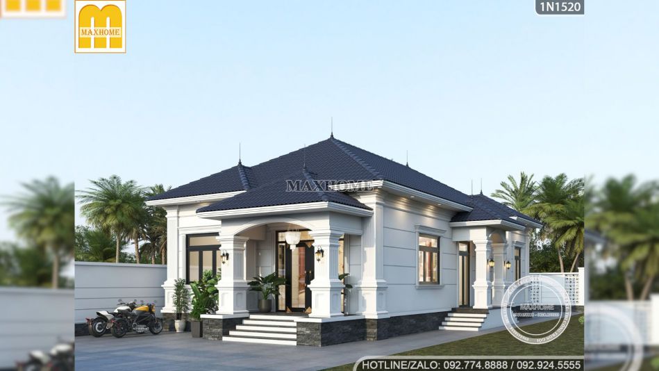 Ngắm nhìn tổng thể, căn nhà cấp 4 3 phòng ngủ hiện lên với một vẻ đẹp thanh thoát lấy gam màu trắng sứ làm chủ đạo giúp làm nổi bật hệ mái Nhật màu xanh than lịch lãm. Điểm nổi bật nhất tạo nên linh hồn cho công trình này chính là các chi tiết ngoại thất tân cổ điển được chắt lọc tinh tế, không quá cầu kỳ nhưng đủ để gây ấn tượng mạnh mẽ ngay từ cái nhìn đầu tiên.