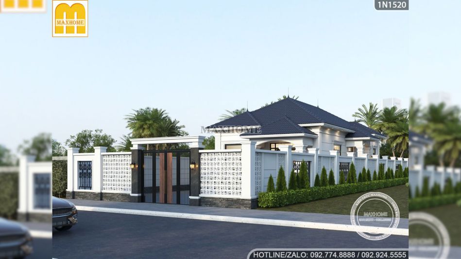 Sự trọn vẹn của mẫu nhà đẹp còn đến từ hệ thống cổng và tường bao được đầu tư bài bản, thống nhất với phong cách của ngôi nhà chính. Tường rào không xây kín mít gây cảm giác bí bách mà được đan xen bằng các ô gạch bông gió trắng và những thanh nan sắt sơn tĩnh điện mỹ thuật. Thiết kế này vừa đảm bảo an ninh vừa tạo ra những khoảng hở cho gió lưu thông, đồng thời phô diễn được vẻ đẹp của căn nhà phía bên trong đối với những người đi đường.