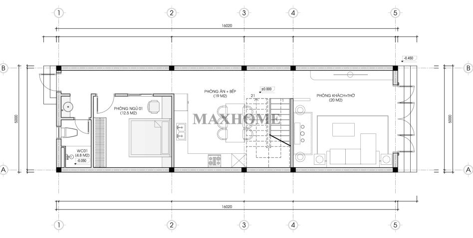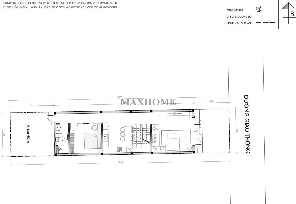 Sở hữu lô đất nhà phố vuông vắn với mặt tiền 5m, chủ đầu tư đã yêu cầu KTS Maxhome phác thảo phương án mặt bằng chi tiết cho mẫu nhà phố hiện đại 3 tầng. Yêu cầu đặt ra là thiết kế phải tối ưu ánh sáng tự nhiên, đón nắng hiệu quả và mang đậm dấu ấn phong cách riêng của gia chủ. Công trình được định hướng theo kiến trúc hiện đại, nổi bật với các mảng khối gọn gàng, đường nét sắc sảo và tỷ lệ hình khối hài hòa.