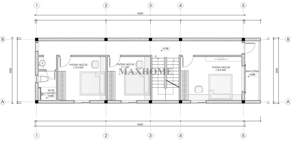 Tầng 2 được bố trí 3 phòng ngủ liền kề, mỗi phòng đều có cửa sổ đón sáng tự nhiên, giúp không gian luôn thông thoáng và dễ chịu. Cuối hành lang là nhà vệ sinh chung, được thiết kế khoa học để thuận tiện cho tất cả thành viên trên tầng này sử dụng, đồng thời đảm bảo sự riêng tư và tiện nghi trong sinh hoạt.