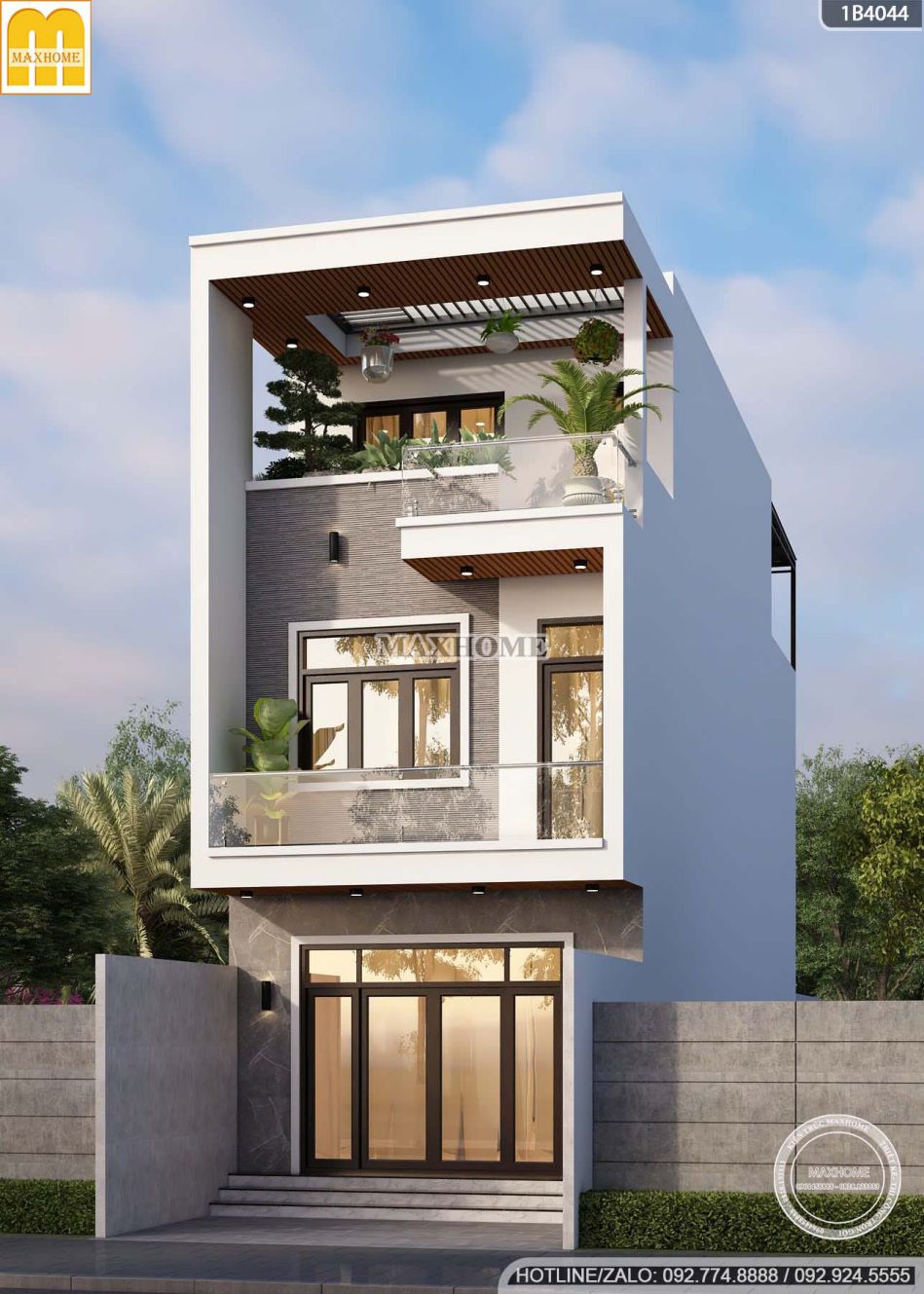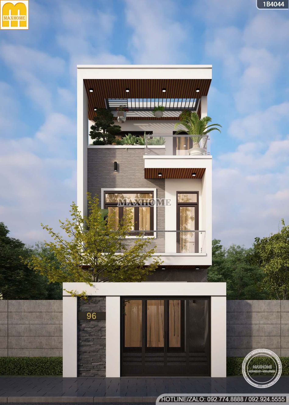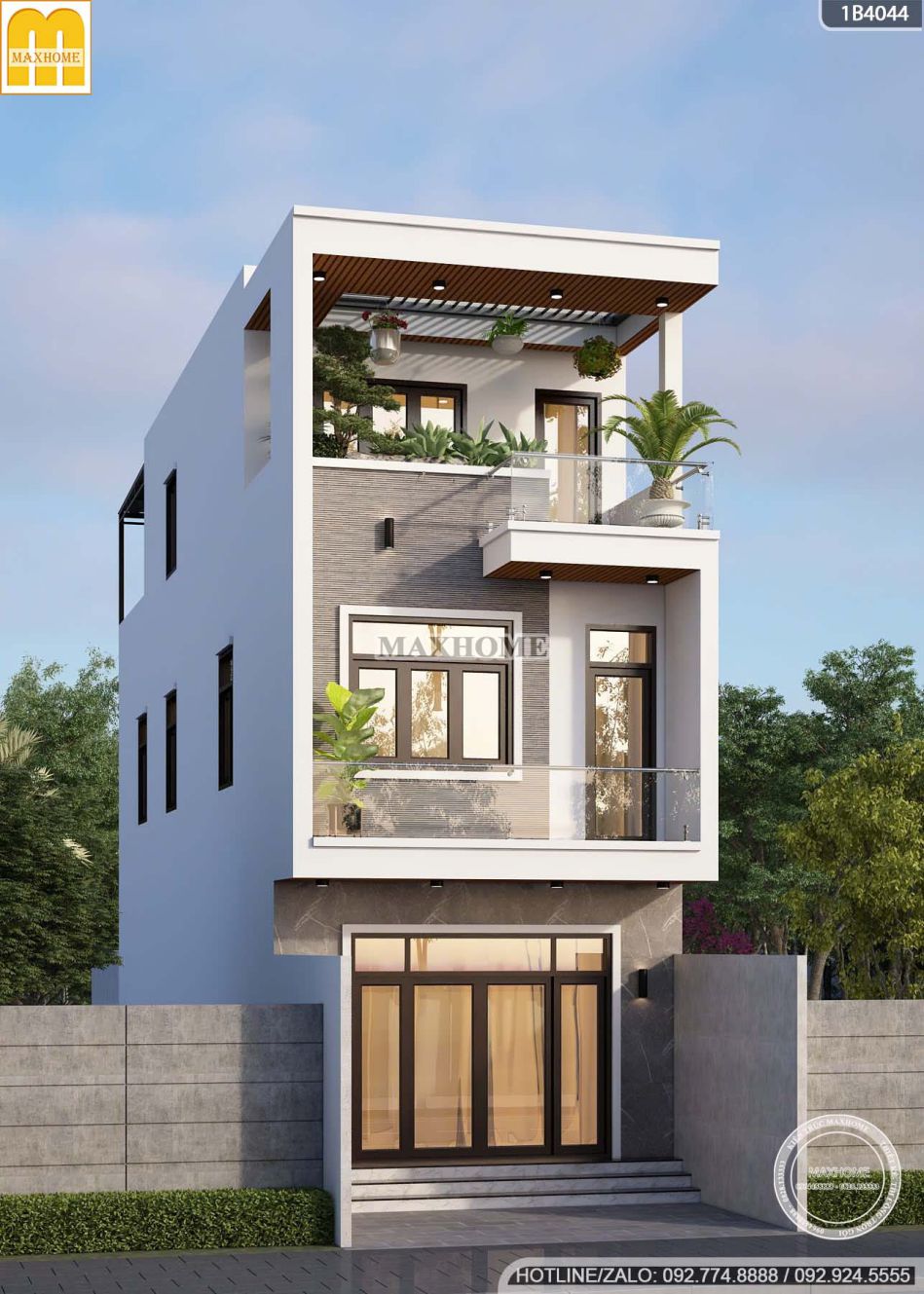 Ngôi nhà phố 3 tầng được thiết kế theo phong cách hiện đại với hệ ban công rộng sử dụng kính cường lực, tạo tầm nhìn thoáng đãng và mang đến không gian lý tưởng để thư giãn, ngắm nhìn cảnh quan xung quanh. Kiến trúc tổng thể được xử lý hài hòa, giúp kết nối mượt mà giữa không gian bên ngoài và bên trong ngôi nhà. Diện tích ban công được tối ưu để đảm bảo khả năng thông gió, đón sáng tự nhiên và tăng tính thẩm mỹ cho mặt tiền. Nhờ đó, công trình vừa giữ được vẻ sang trọng – hiện đại, vừa làm nổi bật các đường nét kiến trúc chủ đạo của mẫu nhà đẹp này.