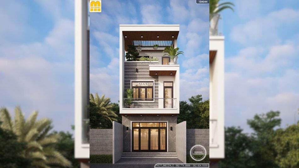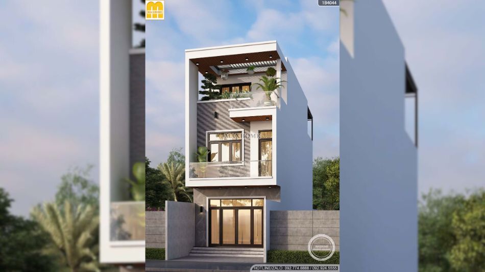 Ngôi nhà phố 3 tầng được thiết kế theo phong cách hiện đại với hệ ban công rộng sử dụng kính cường lực, tạo tầm nhìn thoáng đãng và mang đến không gian lý tưởng để thư giãn, ngắm nhìn cảnh quan xung quanh. Kiến trúc tổng thể được xử lý hài hòa, giúp kết nối mượt mà giữa không gian bên ngoài và bên trong ngôi nhà. Diện tích ban công được tối ưu để đảm bảo khả năng thông gió, đón sáng tự nhiên và tăng tính thẩm mỹ cho mặt tiền. Nhờ đó, công trình vừa giữ được vẻ sang trọng – hiện đại, vừa làm nổi bật các đường nét kiến trúc chủ đạo của mẫu nhà đẹp này.