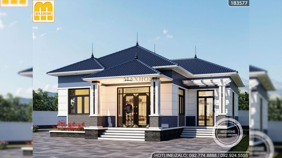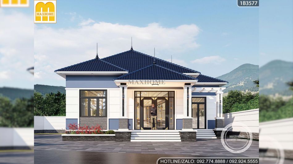 Màu sắc chủ đạo của mẫu nhà đẹp này là sự phối hợp tinh tế giữa sắc trắng sứ và các mảng tường sơn màu xanh ghi làm điểm nhấn. Sự tương phản nhẹ nhàng này giúp tôn lên các đường phào chỉ đắp nổi kích thước 50x100mm chạy dọc quanh nhà. Đặc biệt, các mảng tường dưới cửa sổ và phần áp mái được ốp gạch thẻ và gạch giả đá tạo nên chiều sâu và sự đa dạng về vật liệu cho mặt đứng trục.