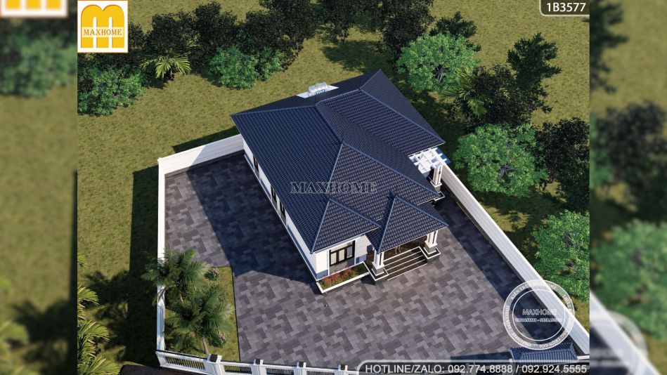 Nhìn vào bản vẽ tổng mặt bằng, ta có thể thấy ngôi nhà của chú Bình được đặt cực kỳ khéo léo trên một khuôn viên đất có hình dáng khá đặc thù và tiếp giáp trực tiếp với trục đường giao thông lớn. Maxhome đã tính toán khoảng lùi công trình hợp lý, tạo ra một khoảng sân phía trước và bên hông rộng rãi giúp tách biệt không gian sống khỏi tiếng ồn và khói bụi từ mặt đường. Ngôi nhà được định vị hướng về phía Đông để tận dụng tối đa luồng gió mát và ánh sáng tự nhiên.