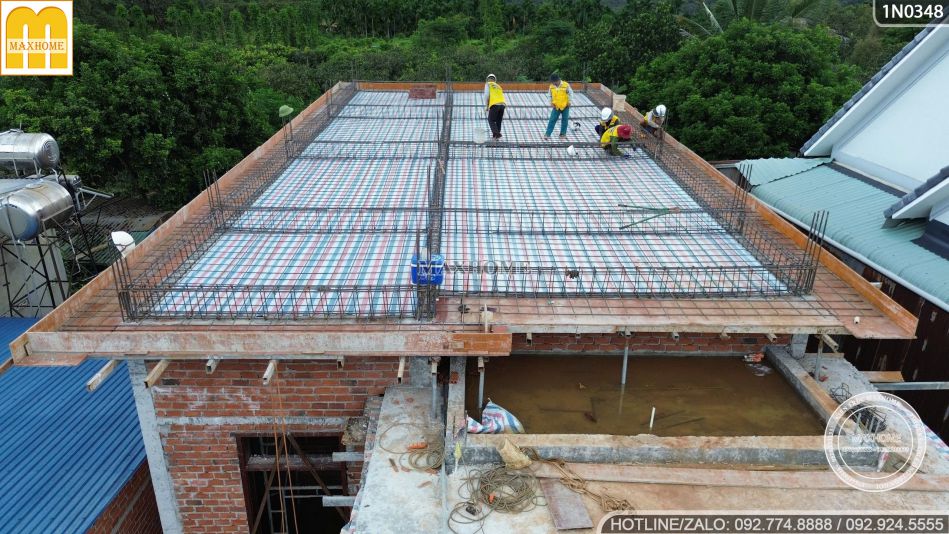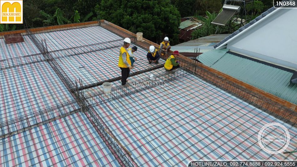 Ở giai đoạn hiện tại, căn nhà vườn của chị Chung đang trong quá trình chuẩn bị thép để đổ sàn tầng mái. Trên thực tế, phần thép sàn đã được bố trí 2 lớp, liên kết bằng dây kẽm và được kê bằng con kê bê tông đúng kỹ thuật giúp tạo lớp bảo vệ chắc chắn khi đổ bê tông. Đội ngũ công nhân Maxhome cũng đang làm việc tỉ mỉ trên mái, từng thanh thép đều được đặt đúng vị trí theo bản vẽ giúp đảm bảo độ chịu lực cho toàn bộ ngôi nhà.