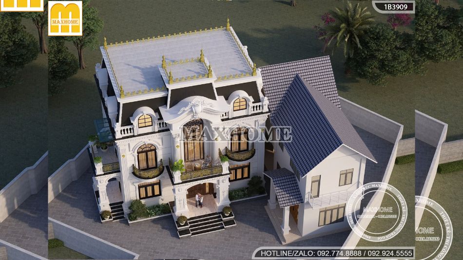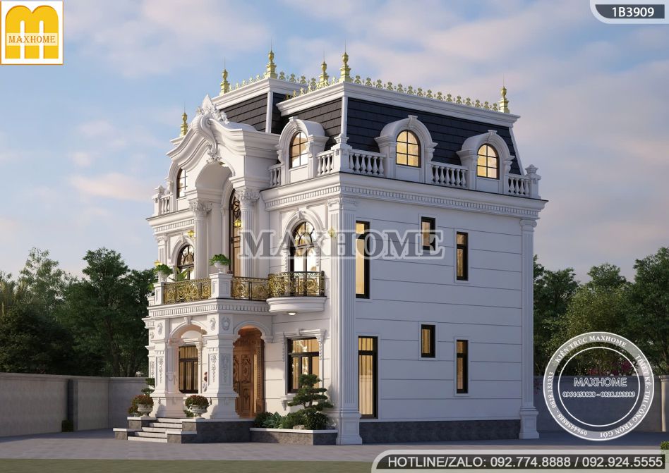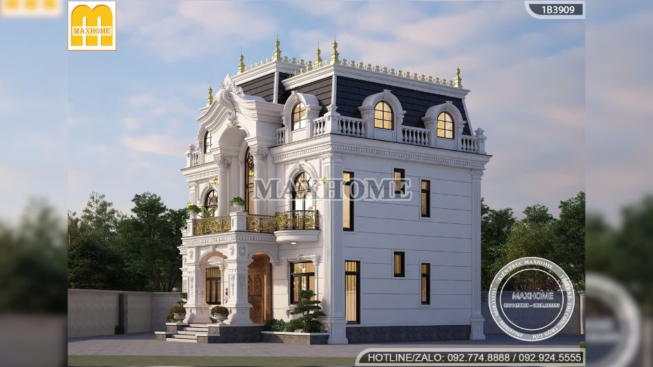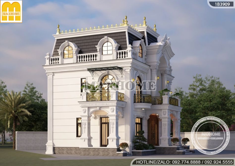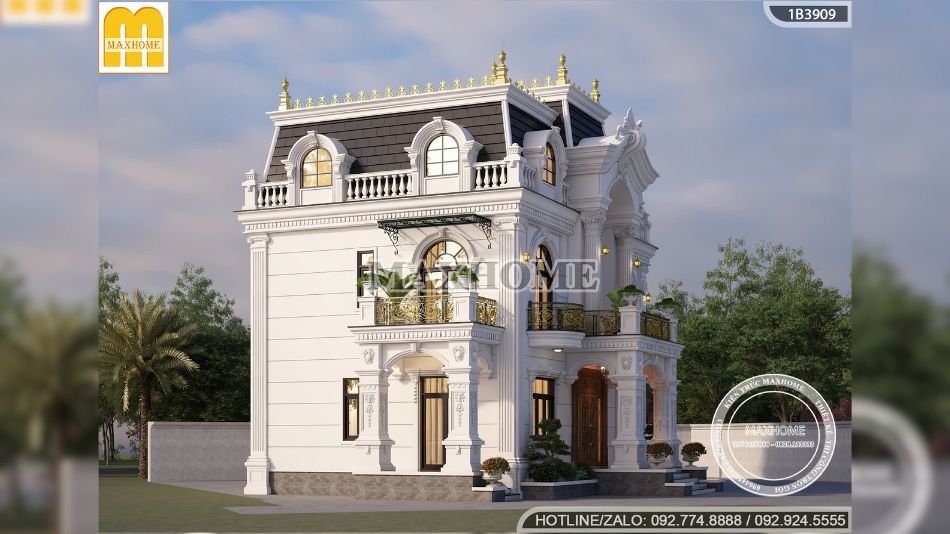Biệt thự tân cổ điển mái Mansard nổi bật giữa khu vực nhờ sự giao thoa tinh tế giữa tinh hoa kiến trúc Pháp và những đường nét trang trí mềm mại, giàu tính nghệ thuật. Tổng thể công trình toát lên vẻ đẹp sang trọng, quyền uy, khẳng định vị thế và gu thẩm mỹ của gia chủ. Mỗi chi tiết thiết kế đều được Maxhome chăm chút kỹ lưỡng, hướng đến việc tối ưu công năng sử dụng, mang lại không gian sống tiện nghi và đẳng cấp.