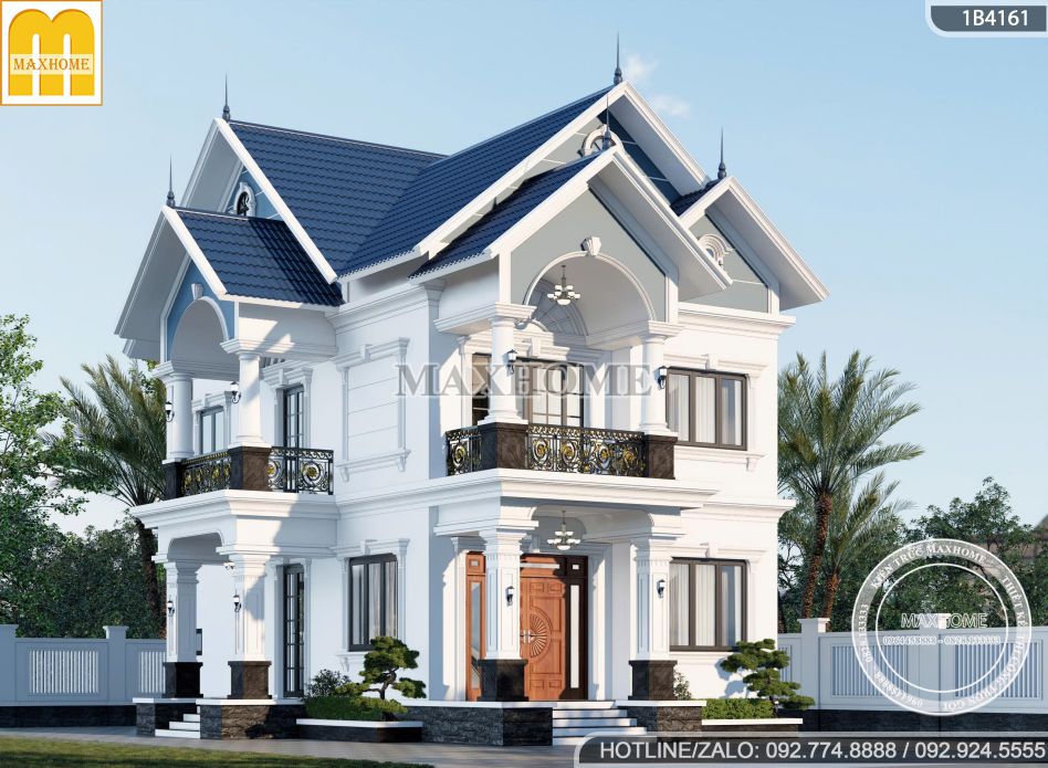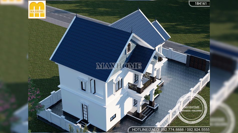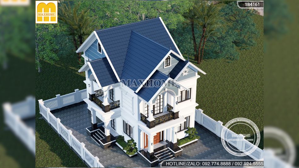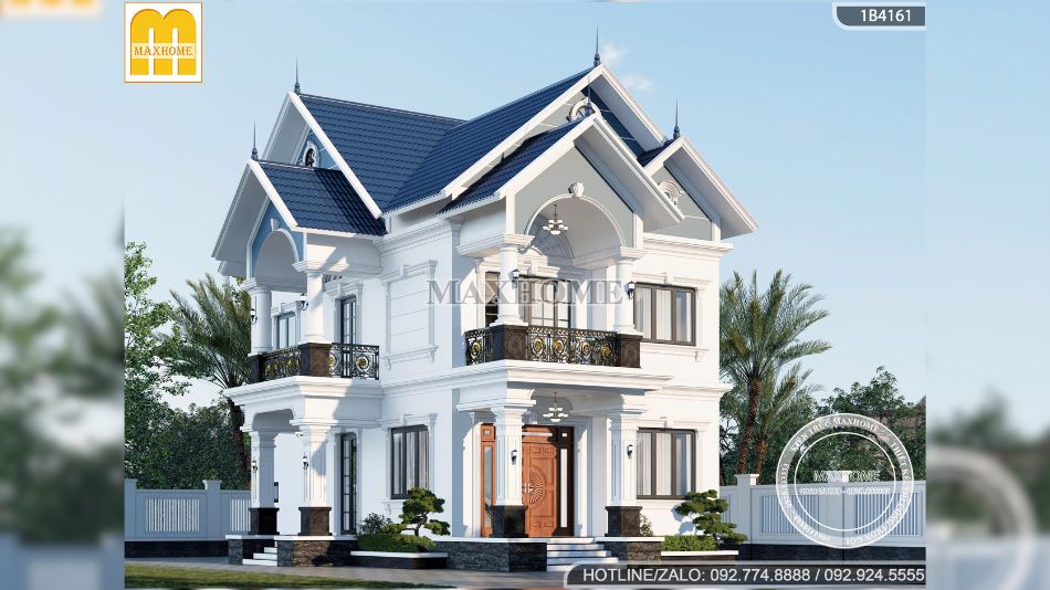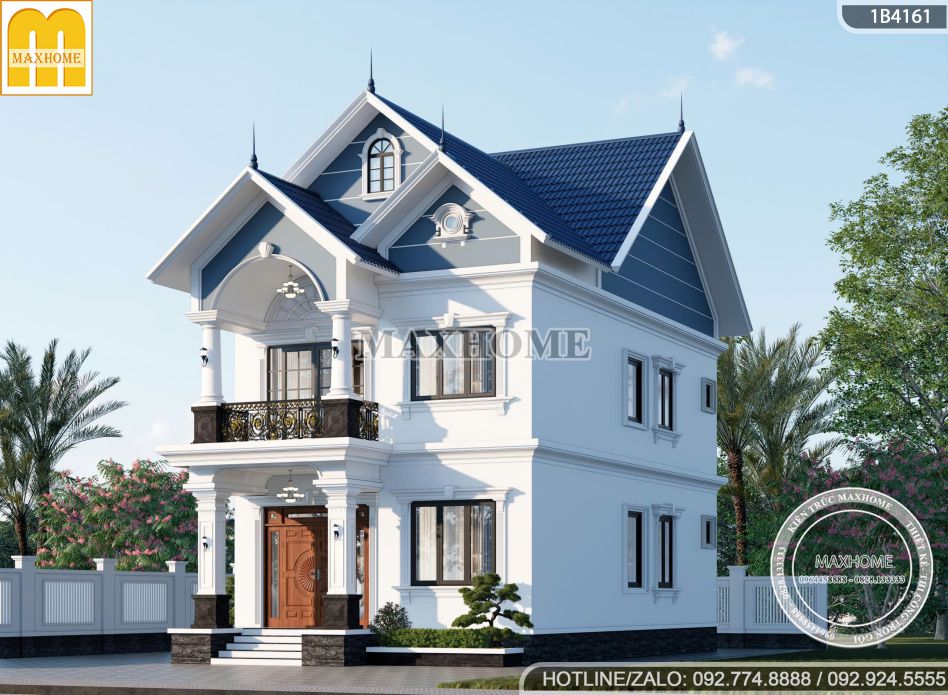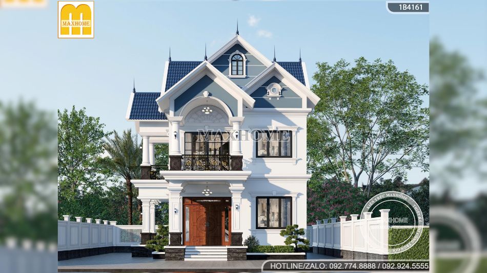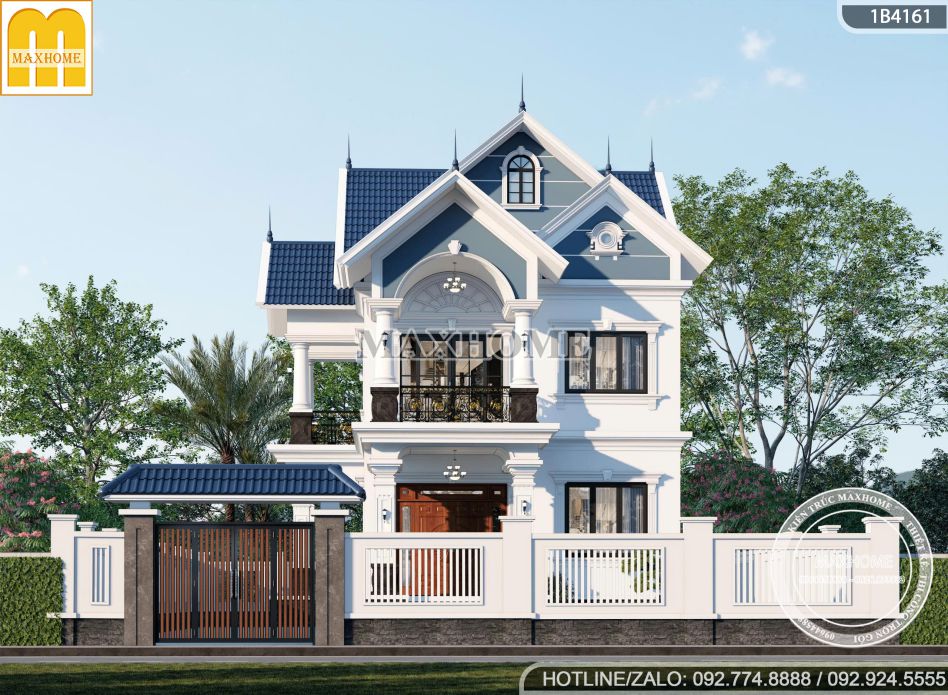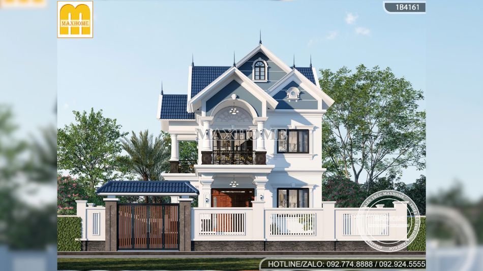 Ngôi nhà lựa chọn gam màu trắng – xanh làm chủ đạo, giúp tổng thể kiến trúc trở nên nổi bật và hài hòa theo từng mảng khối. Sắc trắng làm nền tôn lên các chi tiết phào chỉ, đường nét trang trí tinh tế, trong khi sắc xanh mang đến cảm giác trẻ trung, thanh thoát và dễ chịu.