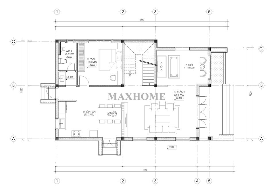 Công năng tầng 1 được bố trí khoa học với không gian phòng khách rộng rãi đặt ở vị trí trung tâm, kết nối trực tiếp với khu vực sảnh chính, tạo cảm giác thông thoáng và sang trọng ngay khi bước vào nhà. Liên thông với phòng khách về bên trái nhà là phòng thờ trang nghiêm.