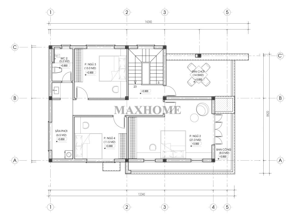 Công năng tầng 2 được bố trí hợp lý với 3 phòng ngủ riêng tư, trong đó phòng ngủ 02 có diện tích rộng, kết nối trực tiếp với ban công thoáng đãng, mang lại không gian nghỉ ngơi thoải mái và thư giãn. Khu vực sảnh thang được tận dụng làm không gian sinh hoạt chung, tạo sự gắn kết giữa các thành viên, đồng thời giúp lưu thông ánh sáng và không khí hiệu quả. Ngoài ra, tầng 2 còn được bố trí khu vệ sinh chung, sân chơi và sân phơi đáp ứng đầy đủ nhu cầu sinh hoạt, vui chơi và nâng cao chất lượng sống cho cả gia đình.