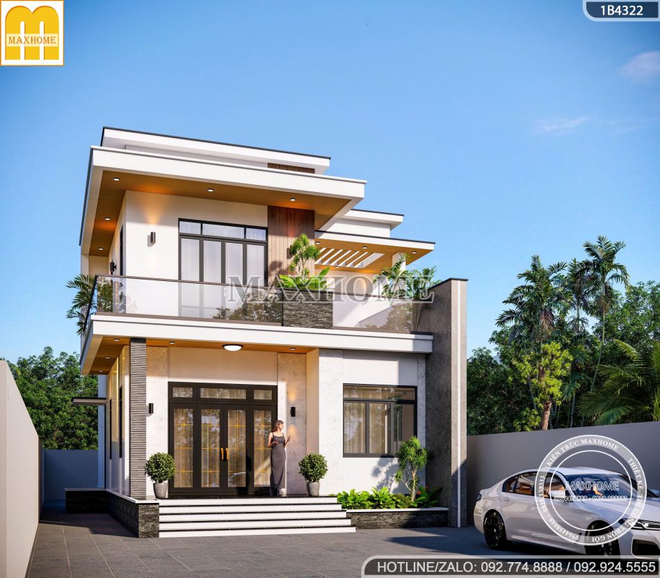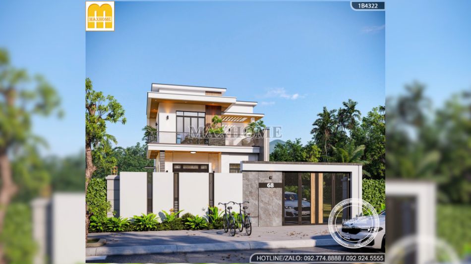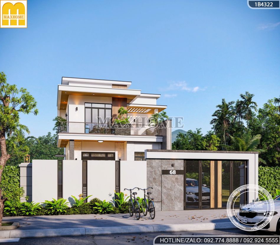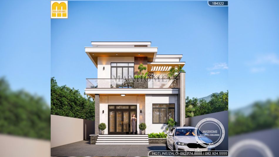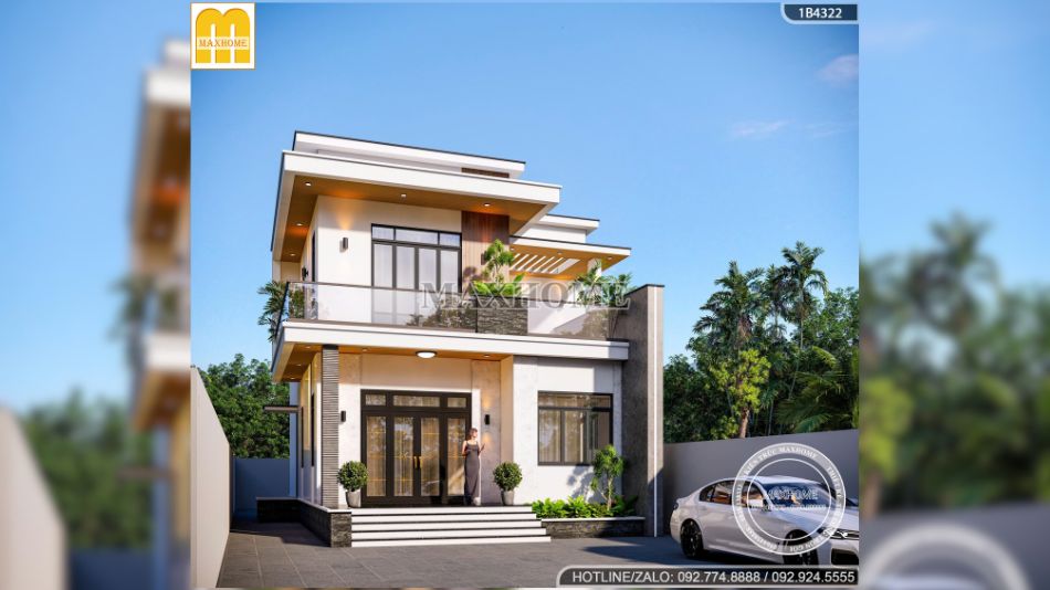 Mặt tiền của mẫu thiết kế nhà đẹp này được xử lý rất tinh tế. Sự kết hợp giữa mảng tường trắng sáng, ốp đá tự nhiên và các chi tiết gỗ nhựa trang trí mang lại chiều sâu cho kiến trúc.