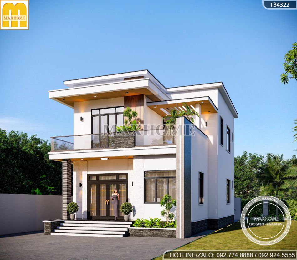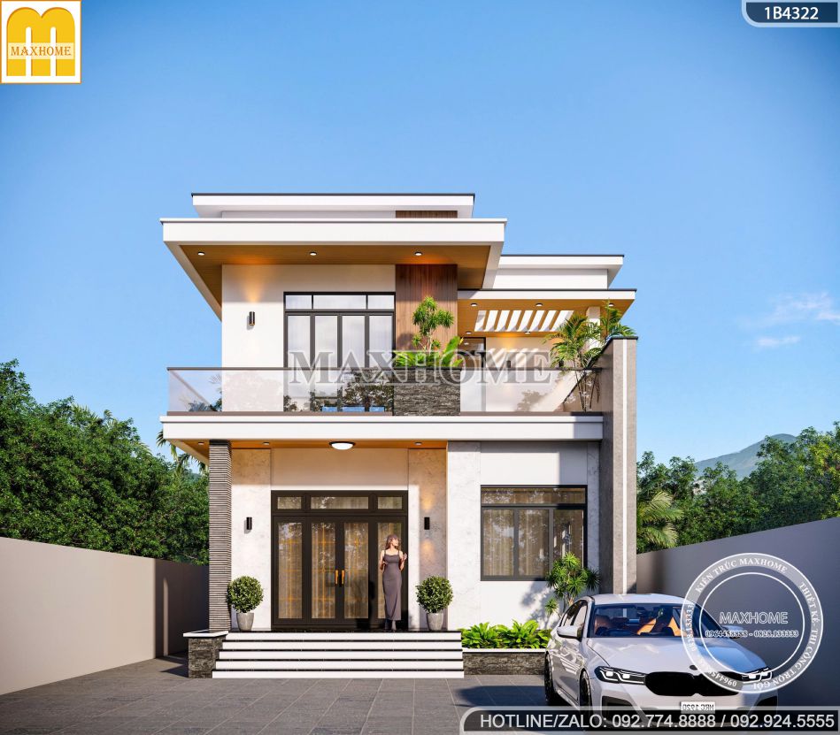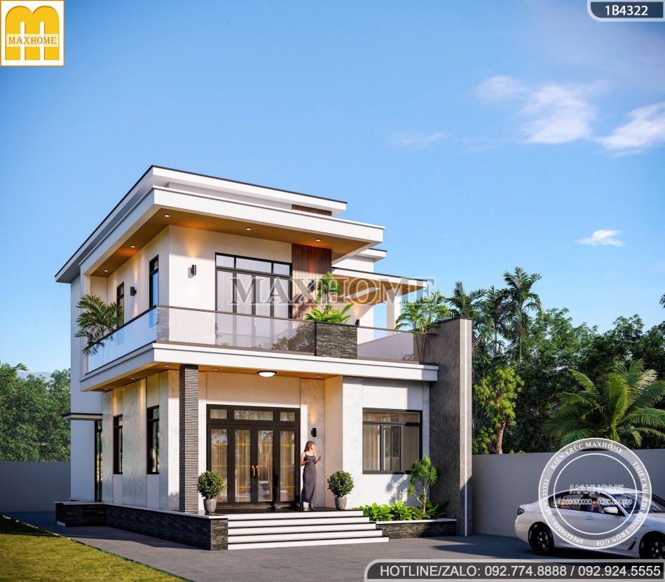 Điểm ấn tượng đầu tiên của mẫu nhà 2 tầng mái bằng chính là tổng thể hình khối mạnh mẽ, được tạo hình từ các khối hộp vuông vức, xếp lớp có chủ đích, tạo cảm giác chắc chắn nhưng không hề nặng nề. Kiến trúc mái bằng giúp tổng thể ngôi nhà trở nên gọn gàng, hiện đại và mang hơi thở của xu hướng thiết kế mới. Các đường ngang được nhấn mạnh qua mái đua, ban công và lan can kính tạo nên sự cân đối thị giác, đồng thời giúp công trình trông rộng rãi và bề thế hơn so với diện tích thực.