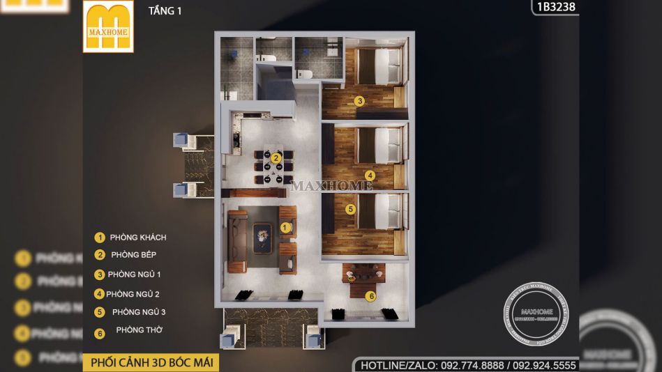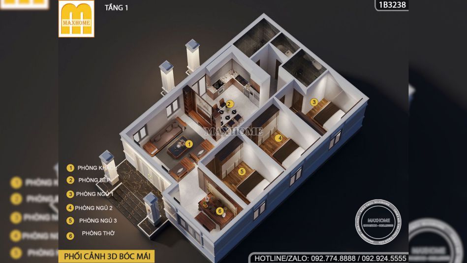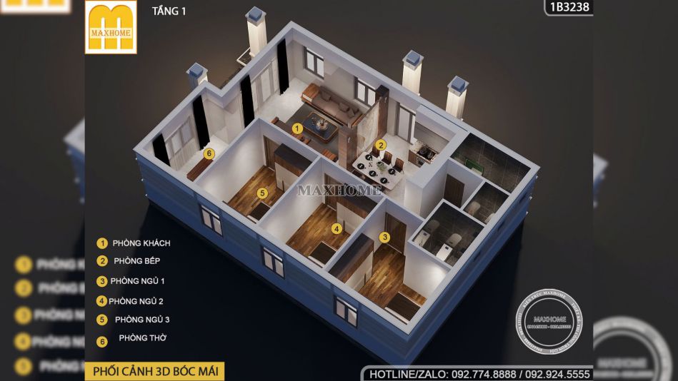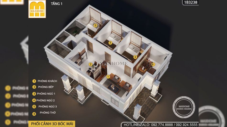 Đi sâu vào bên trong, mặt bằng công năng cho thấy một sự sắp xếp khoa học với không gian phòng khách rộng rãi kết nối trực thông với khu vực phòng thờ trang trọng ở vị trí đẹp nhất của ngôi nhà. Khu vực bếp và phòng ăn được thiết kế mở tạo sự liền mạch và thuận tiện cho sinh hoạt gia đình, đồng thời có lối tiếp cận trực tiếp từ sảnh phụ để đảm bảo tính riêng tư khi nhà có khách.