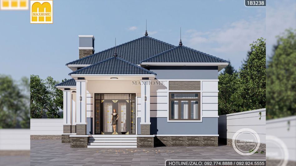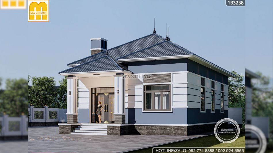 Ở góc nhìn trên cao có thể thấy được hệ mái Nhật màu xanh ghi độc đáo được thiết kế mở rộng ra các hướng, tạo nên một diện mạo thanh thoát và cân đối. Maxhome cũng đã khéo léo thiết kế hệ mái phân tầng với các khối mái chính và mái sảnh đan xen giúp ngôi nhà trông cao ráo hơn hẳn so với các mẫu nhà cấp 4 thông thường. Đặc biệt, trên đỉnh mái còn được bố trí các cột thu lôi thanh mảnh và chi tiết ống khói giả ốp gạch trang trí gợi liên tưởng đến những căn nhà xưa truyền thống có hình ảnh ống khói cùng bếp củi lửa.