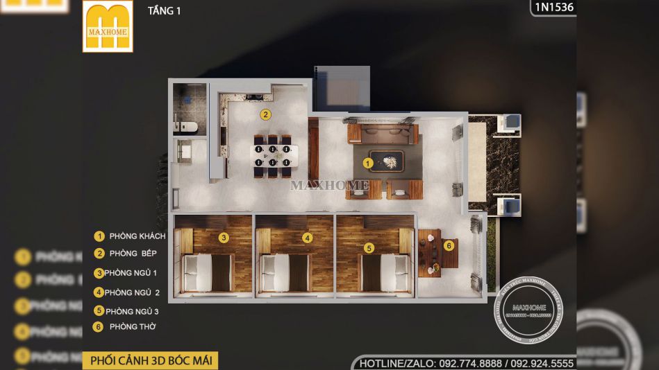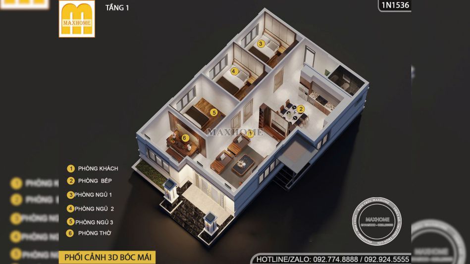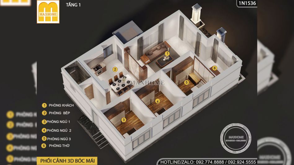 Về phương án bố trí công năng, các kiến trúc sư Maxhome đã khéo léo sắp xếp các khu vực sinh hoạt một cách khoa học và tối ưu diện tích sử dụng. Từ sảnh chính đi vào là không gian phòng khách rộng 25,5m2 sang trọng, cạnh đó là phòng thờ trang nghiêm có diện tích 9,5m2 hướng ra mặt tiền. Khu vực bếp và phòng ăn rộng 22,5m2 được đặt phía sau, có cửa sảnh phụ riêng biệt giúp việc đi lại và thoát mùi thức ăn trở nên thuận tiện hơn.