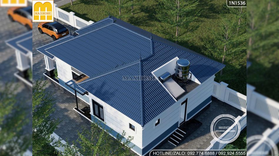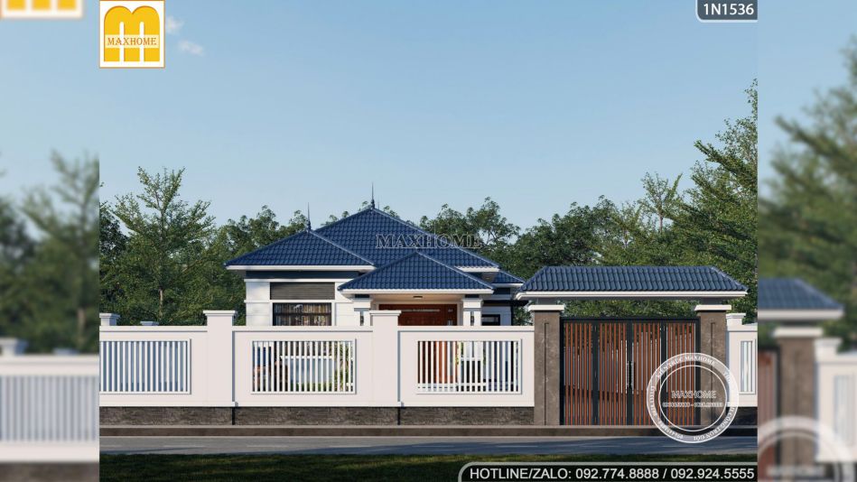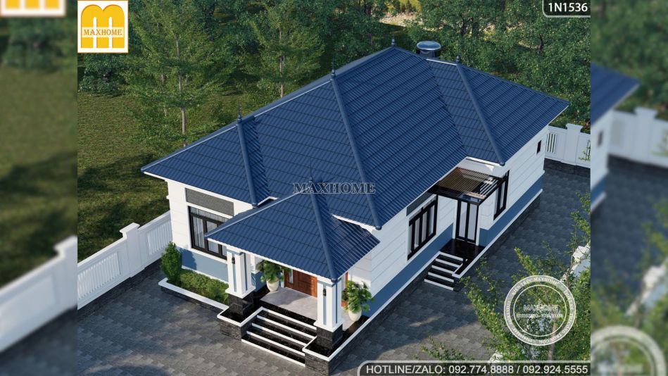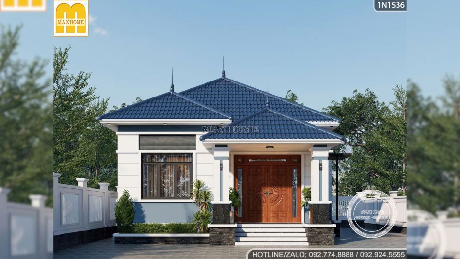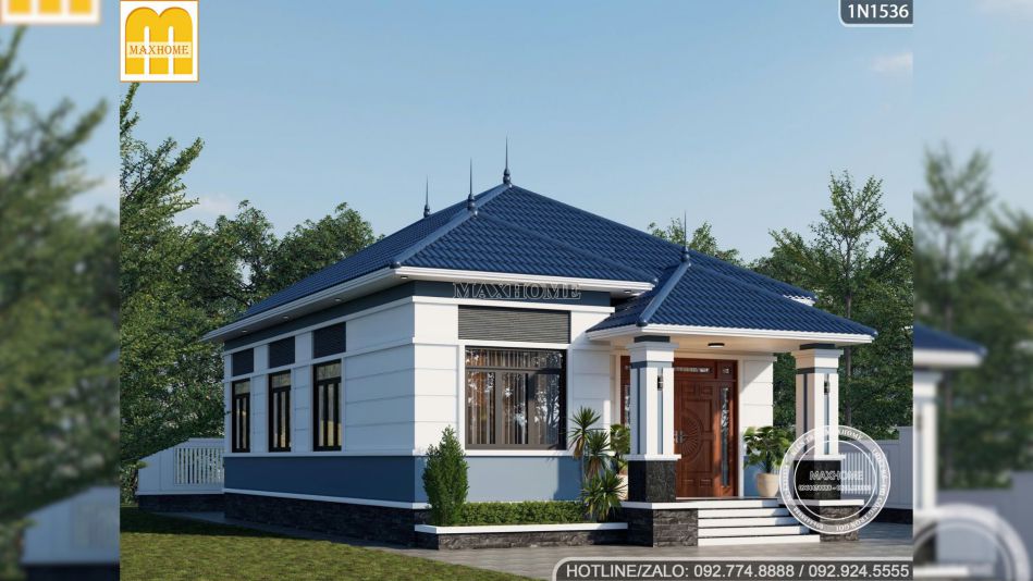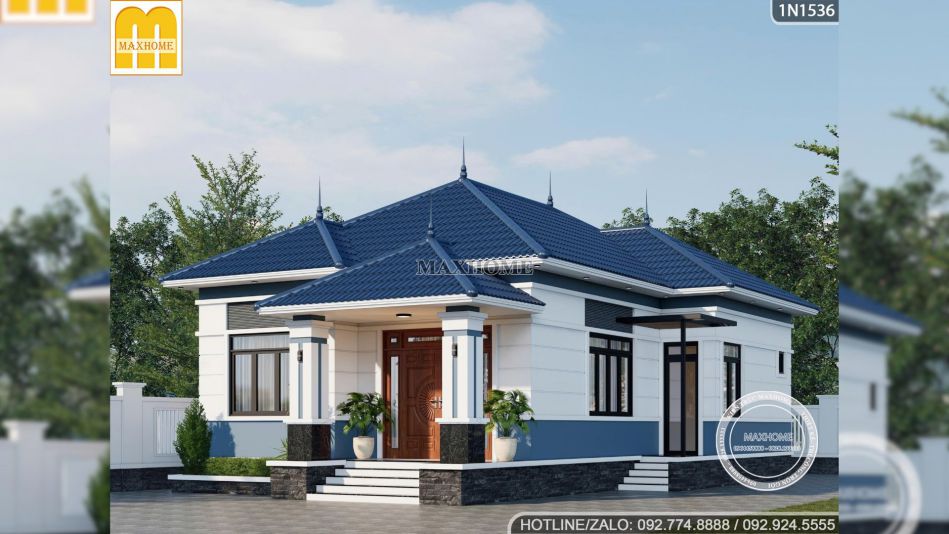 Sự tỉ mỉ của Maxhome còn được thể hiện qua các chi tiết trang trí ngoại thất đầy tính nghệ thuật. Khu vực sảnh chính được thiết kế khang trang với hai cột vuông to bản, uy nghi nâng đỡ toàn bộ mái hiên. Điểm khéo léo nằm ở chi tiết đường kẻ chỉ lớn giữa thân cột được sơn màu xanh đồng điệu với hệ mái tạo nên một sợi dây liên kết vô hình nhưng chặt chẽ trong ngôn ngữ thiết kế. Ở phía dưới, phần chân tường bao quanh ngôi nhà được ốp gạch trang trí tông màu đen tuyền giúp bảo vệ diện tường khỏi rêu mốc, bụi bẩn từ đất đỏ bazan và tạo ra một bệ đỡ thị giác cực kỳ vững chắc, làm nổi bật lên vẻ đẹp hiện đại của mẫu nhà cấp 4 3 phòng ngủ này. Trên các diện tường trắng, những đường chỉ âm tường kích thước 40x20mm được kẻ đều đặn, xóa đi sự đơn điệu của những mảng tường phẳng thông thường và mang đến những nhịp điệu kiến trúc tinh tế và sắc nét.