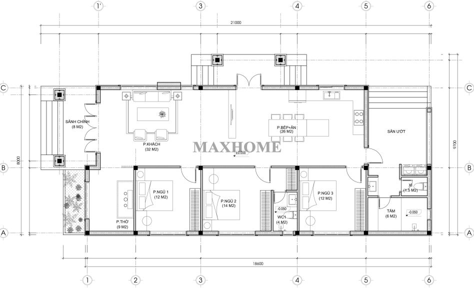 Không gian phòng thờ – khu vực giữ vai trò quan trọng trong đời sống tâm linh của người Việt – được bố trí trang nghiêm, yên tĩnh, đảm bảo sự tôn nghiêm và phù hợp phong thủy. Khu vực nghỉ ngơi gồm 3 phòng ngủ được sắp xếp liền kề, thuận tiện cho sinh hoạt gia đình; trong đó phòng ngủ 02 được thiết kế nhà vệ sinh khép kín, mang lại sự riêng tư và tiện lợi. Cuối nhà bố trí khu vực sân ướt kết hợp nhà vệ sinh chung và phòng tắm, giúp không gian luôn thông thoáng, sạch sẽ và đáp ứng đầy đủ nhu cầu sinh hoạt hằng ngày.