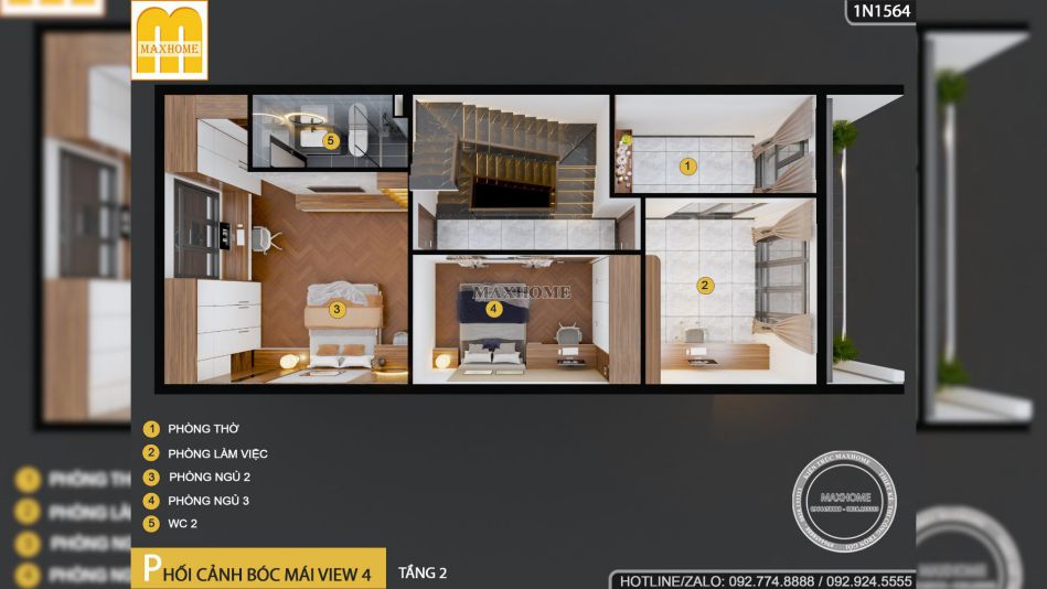 Tầng 2 bố trí riêng phòng thờ đặt ở vị trí trang trọng, yên tĩnh, hướng ra ban công rộng lớn phía trước mà vẫn đảm bảo sự trang nghiêm và thuận tiện cho gia đình thực hiện các nghi lễ. Kế bên là phòng làm việc dành cho những giờ tập trung cao độ hoặc học tập. Hai phòng ngủ được sắp xếp cạnh nhau mang đến sự thoải mái cho các thành viên. Riêng phòng ngủ 02 sở hữu riêng nhà vệ sinh khép kín bên trong, đây cũng được coi là phòng ngủ master vì sự tiện nghi đầy đủ trong căn phòng.