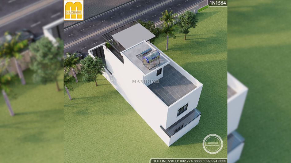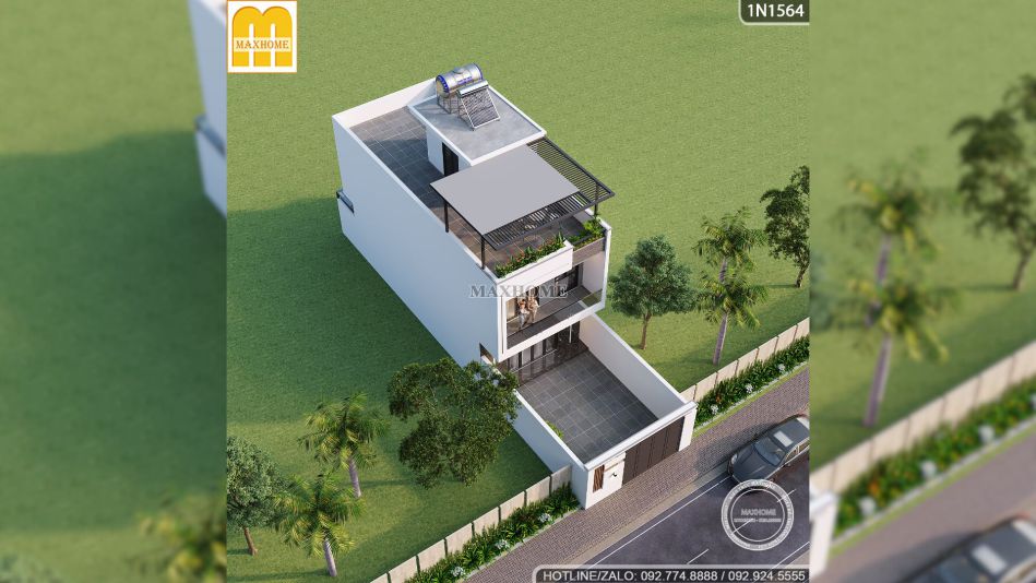 Từ mặt tiền chính diện, mẫu nhà phố 2 tầng 1 tum gây thiện cảm nhờ bố cục hình khối mạnh mẽ nhưng vẫn giữ được sự tinh tế. Maxhome tận dụng những đường nét vuông vắn và dứt khoát để tạo sự hiện đại, sau đó kết hợp với những mảng giật cấp nhẹ nhằm tăng chiều sâu cho ngôi nhà. Màu sơn trắng chủ đạo giúp tổng thể trông sạch sẽ và sáng sủa hơn, trong khi các chi tiết ốp đá ở tầng 1 lại mang đến cảm giác chắc chắn và sang trọng. Sự tương phản vật liệu được xử lý rất khéo léo giúp mặt tiền nổi bật mà không bị rối mắt.