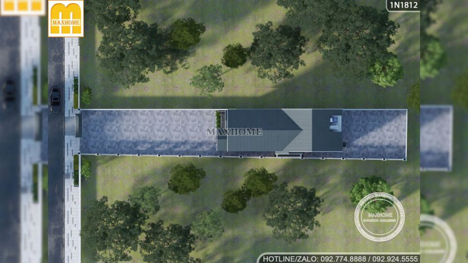 Nhắc đến mái Thái, đây là phần thể hiện rõ nhất sự công phu trong thiết kế lần này. Mái Thái cao đến 4,6m, tạo ra tỷ lệ rất hài hòa cho tổng thể công trình nhà 2 tầng của anh Hậu. Chiều cao này không chỉ mang lại vẻ thanh thoát mà còn giúp nhà thoáng hơn và giảm nóng trong những ngày nắng gắt. Các mái đều có độ đua hợp lý để thoát nước tốt, hạn chế thấm dột. Nhìn từ xa, phần mái như một chiếc vương miện vừa vững chãi vừa tinh tế và làm nổi bật phong cách tân cổ điển mà Maxhome muốn gửi gắm vào công trình.