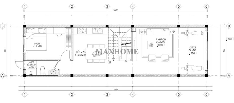 Công trình được xây dựng theo hướng Nam – một trong những hướng nhà được đánh giá cao về phong thủy nhờ khả năng đón gió mát và ánh sáng ổn định quanh năm. Ngôi nhà có kích thước 4,5 x 16,6m phù hợp với đặc trưng của nhà phố hiện đại. Tổng diện tích sử dụng khoảng 178m², được bố trí hợp lý để tối ưu công năng, mang đến không gian sống tiện nghi và thoải mái cho gia đình.