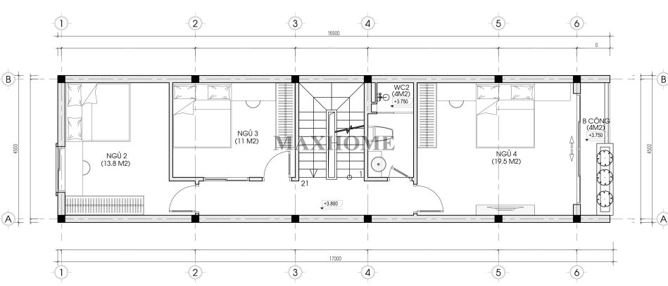Tầng 2 được bố trí gồm 3 phòng ngủ, đáp ứng nhu cầu sinh hoạt của các thành viên trong gia đình. Trong đó, phòng ngủ số 04 có thiết kế ban công thoáng mát, giúp đón gió và ánh sáng tự nhiên, tạo không gian thư giãn dễ chịu. Các phòng ngủ trên tầng này sử dụng chung một nhà vệ sinh, bố trí hợp lý để thuận tiện cho việc sinh hoạt hằng ngày.