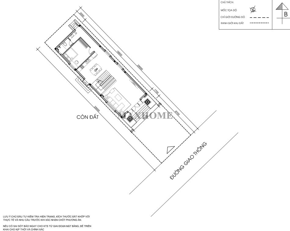 Tiếp theo là hình ảnh mặt bằng định vị công trình nhà phố tân cổ điển, giúp thể hiện rõ ranh giới khu đất xây dựng, vị trí đặt công trình trên lô đất cũng như mối liên hệ giữa ngôi nhà với không gian xung quanh, từ đó dễ dàng hình dung tổng thể quy mô và bố trí mặt bằng.