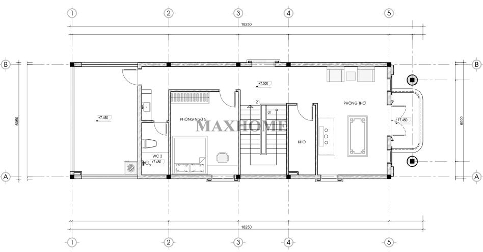 Tầng 3 được bố trí không gian phòng thờ trang nghiêm, đặt ở vị trí ưu tiên và hướng ra ban công, đảm bảo sự thông thoáng cũng như yếu tố phong thủy. Bên cạnh đó, tầng này còn có một phòng kho nhỏ gọn, thuận tiện cho việc lưu trữ đồ dùng sinh hoạt. Khu vực cuối nhà là phòng ngủ, được sắp xếp hợp lý và sử dụng chung nhà vệ sinh đặt liền kề, vừa đảm bảo sự riêng tư cần thiết, vừa tối ưu diện tích và công năng sử dụng cho toàn bộ mặt bằng.