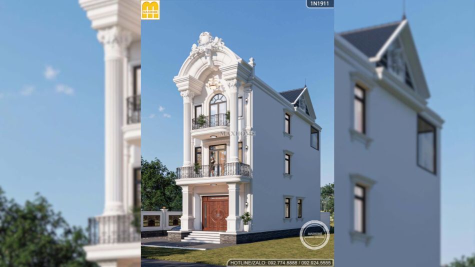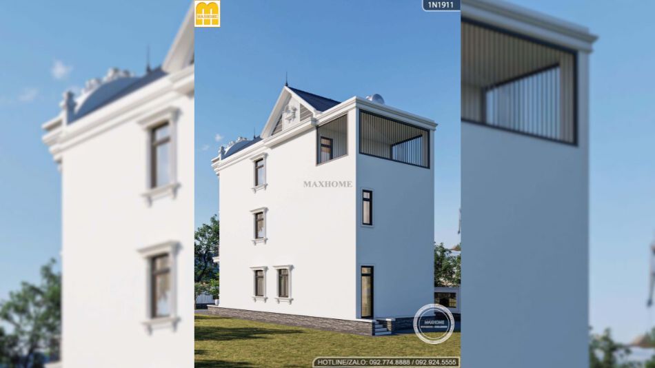 Tại khu vực tầng 3, ban công được thiết kế với đường nét mềm mại, uốn cong duyên dáng, kết hợp cùng hệ lan can sắt mỹ thuật tạo hình tinh xảo, góp phần làm nổi bật đặc trưng thanh lịch của phong cách tân cổ điển. Chi tiết cong này không chỉ tạo điểm nhấn kiến trúc độc đáo cho mặt tiền mà còn giúp tổng thể công trình trở nên nhẹ nhàng, uyển chuyển hơn. Đặc biệt, gam màu trắng được lựa chọn làm màu sắc chủ đạo càng tôn lên vẻ sang trọng, tinh khôi và giúp các chi tiết phào chỉ, hoa văn trang trí trở nên nổi bật hơn.