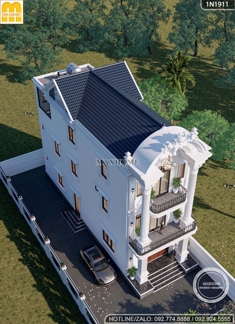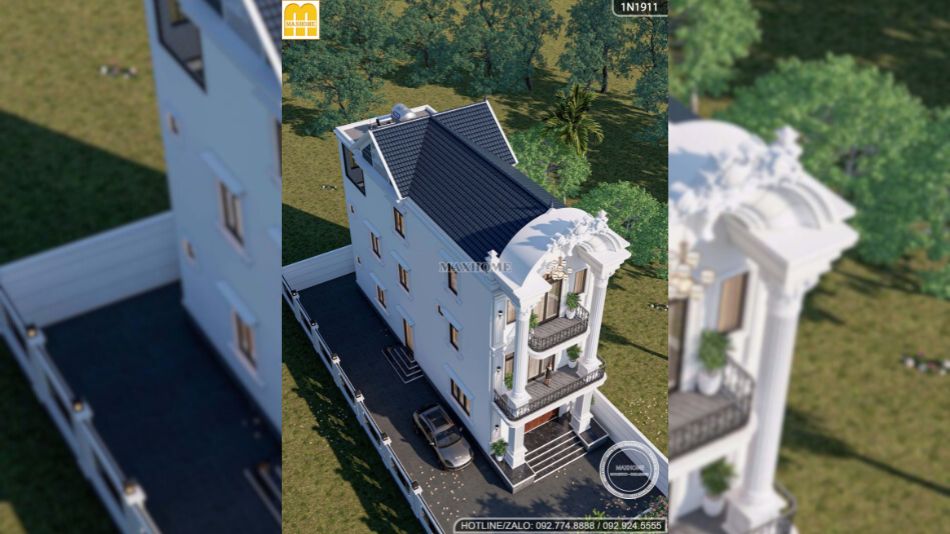Nếu nhắc đến những mẫu nhà tạo ấn tượng mạnh ngay từ ánh nhìn đầu tiên, thì thiết kế nhà phố tân cổ điển 3 tầng dưới đây chính là một đại diện tiêu biểu. Công trình không chỉ gây choáng ngợp bởi hình khối bề thế, tỷ lệ cân đối mà còn thể hiện rõ sự tinh tế, khéo léo của kiến trúc sư trong việc bố trí và kết hợp linh hoạt các loại mái. Giải pháp thiết kế này vừa nâng cao giá trị thẩm mỹ tổng thể, vừa tối ưu công năng sử dụng, đảm bảo sự tiện nghi và phù hợp với nhu cầu sinh hoạt lâu dài của gia đình.