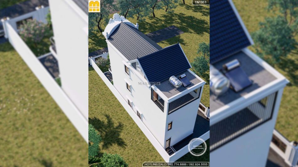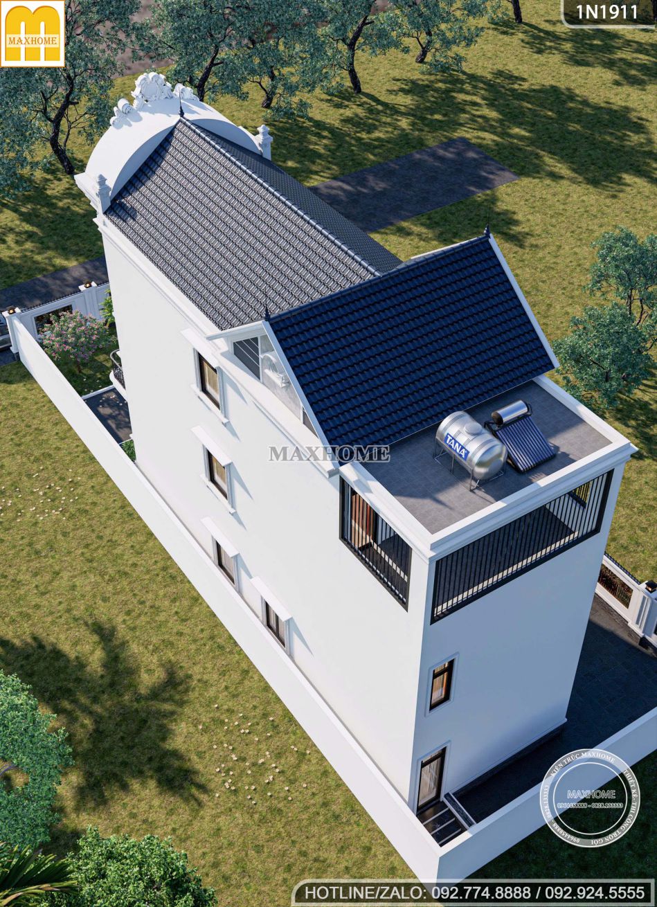 Điểm độc đáo của mẫu nhà phố tân cổ điển này nằm ở giải pháp kết hợp linh hoạt nhiều loại mái khác nhau, vừa đáp ứng yêu cầu thẩm mỹ vừa tối ưu công năng sử dụng. Phía trước công trình sử dụng hệ mái vòm mềm mại, tạo dấu ấn sang trọng và đậm chất tân cổ điển; khu vực giữa là mái Thái cao ráo giúp chống nóng hiệu quả, đồng thời tăng chiều cao và độ thông thoáng cho không gian bên trong. Trong khi đó, phần cuối nhà được bố trí mái bằng, thuận tiện cho việc đặt bồn nước, hệ thống thái dương năng và tổ chức khu sân phơi.