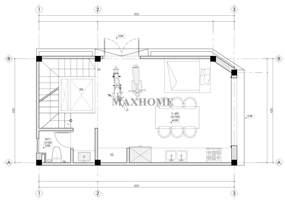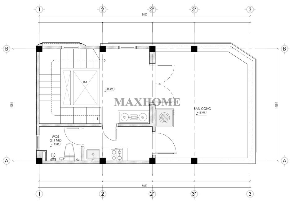 Tầng tum được bố trí khu vực bếp phụ, thuận tiện cho các bữa tiệc nhỏ hoặc những nhu cầu nấu nướng riêng biệt. Không gian này kết hợp cùng ban công thoáng đãng, giúp tăng khả năng thông gió, lấy sáng tự nhiên và tạo khoảng thư giãn cho gia đình. Ngoài ra, một nhà vệ sinh chung cũng được sắp xếp tại tầng tum, đảm bảo sự tiện lợi trong quá trình sử dụng và góp phần hoàn thiện công năng cho toàn bộ ngôi nhà.