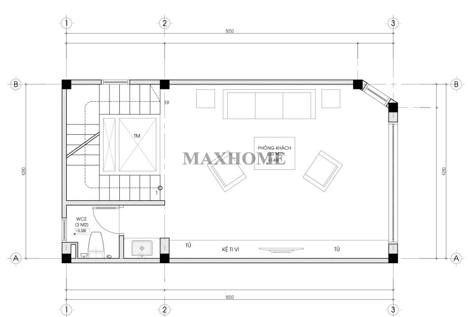 Tầng 2 được bố trí không gian phòng khách rộng rãi, là nơi sinh hoạt chung và tiếp đón khách của gia đình. Khu vực này được trang bị bộ sofa hiện đại, kệ tivi gọn gàng, tạo nên tổng thể hài hòa và tiện nghi. Bên cạnh đó, một nhà vệ sinh chung được sắp xếp ở cuối nhà, đảm bảo sự thuận tiện trong quá trình sử dụng mà vẫn giữ được sự riêng tư, đồng thời giúp tối ưu diện tích cho toàn bộ mặt bằng.
