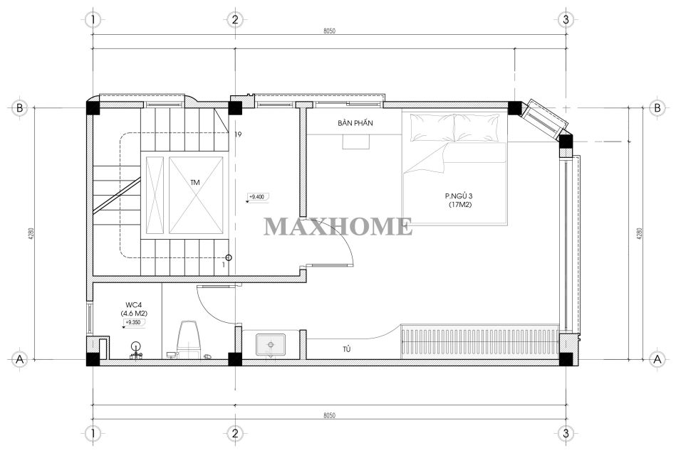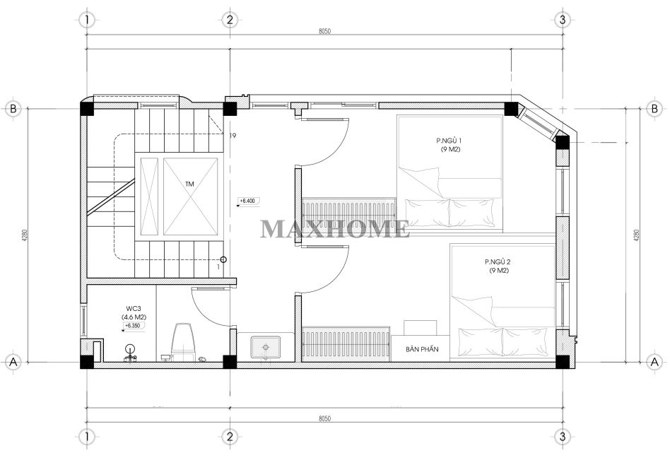 Tại tầng 3, không gian được bố trí hai phòng ngủ đặt liền kề nhau, thuận tiện cho việc sinh hoạt và kết nối giữa các thành viên trong gia đình. Cả hai phòng cùng sử dụng một nhà vệ sinh chung, được sắp xếp ở vị trí hợp lý nhằm tối ưu diện tích, đảm bảo sự tiện nghi trong quá trình sử dụng hằng ngày mà vẫn giữ được sự riêng tư cần thiết.