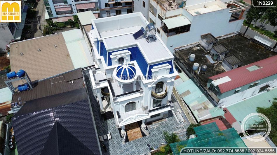 Biệt thự 3 tầng mái Mansard được khoác lên mình gam màu trắng tinh tế làm chủ đạo, mang đến vẻ đẹp sang trọng và thanh thoát. Điểm nhấn nổi bật nằm ở phần chân cột và các chi tiết bê tông con tiện được sơn giả đá tinh xảo, giúp công trình thêm phần kiêu sa và đẳng cấp. Bên trên, hệ mái Mansard màu xanh than nổi bật không chỉ tạo nên sự tương phản hài hòa với tổng thể kiến trúc mà còn góp phần tôn lên phong cách châu Âu cổ điển. Tất cả hòa quyện hoàn hảo, tạo nên một diện mạo biệt thự ấn tượng, sang trọng và đầy cuốn hút giữa không gian xung quanh.