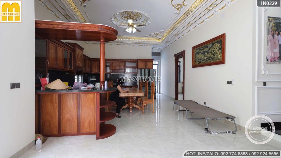 Toàn bộ không gian nội thất của biệt thự 3 tầng mái Mansard được thiết kế tinh tế với chất liệu gỗ tự nhiên cao cấp, mang đến cảm giác ấm cúng, sang trọng và bền vững theo thời gian. Các chi tiết nội thất như trần, cửa, cầu thang và đồ trang trí đều được chạm khắc tỉ mỉ, thể hiện sự đẳng cấp và gu thẩm mỹ tinh tế của gia chủ. Lớp rèm mềm mại được bố trí khéo léo ngăn cách giữa phòng khách và khu vực bếp ăn, vừa tạo sự riêng tư cần thiết, vừa đảm bảo tính liên kết không gian mở, giúp căn nhà luôn thông thoáng, tiện nghi và đầy sức sống.
