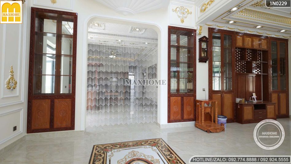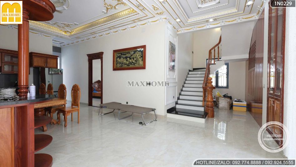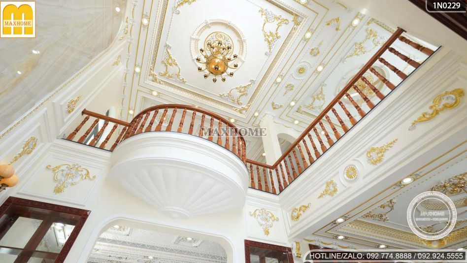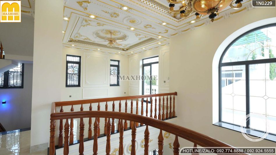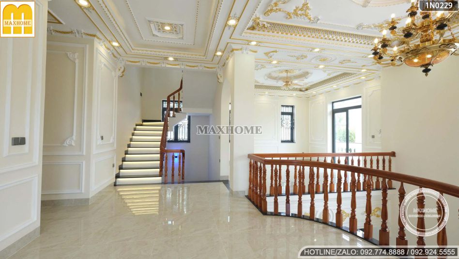 Gia chủ là người có gu thẩm mỹ tinh tế và đặc biệt yêu thích phong cách sang trọng, đẳng cấp, vì vậy không gian nội thất bên trong biệt thự được thiết kế vô cùng cầu kỳ và tỉ mỉ. Nhiều chi tiết trang trí được mạ vàng sang trọng, kết hợp cùng hệ phào chỉ tinh xảo, đèn chùm pha lê và đồ nội thất cao cấp tạo nên tổng thể xa hoa, thể hiện rõ đẳng cấp thượng lưu của chủ nhân ngôi nhà. Hiện tại, công trình đang trong giai đoạn hoàn thiện và sắp xếp nội thất, hứa hẹn sẽ mang đến một không gian sống tráng lệ và tiện nghi bậc nhất.
