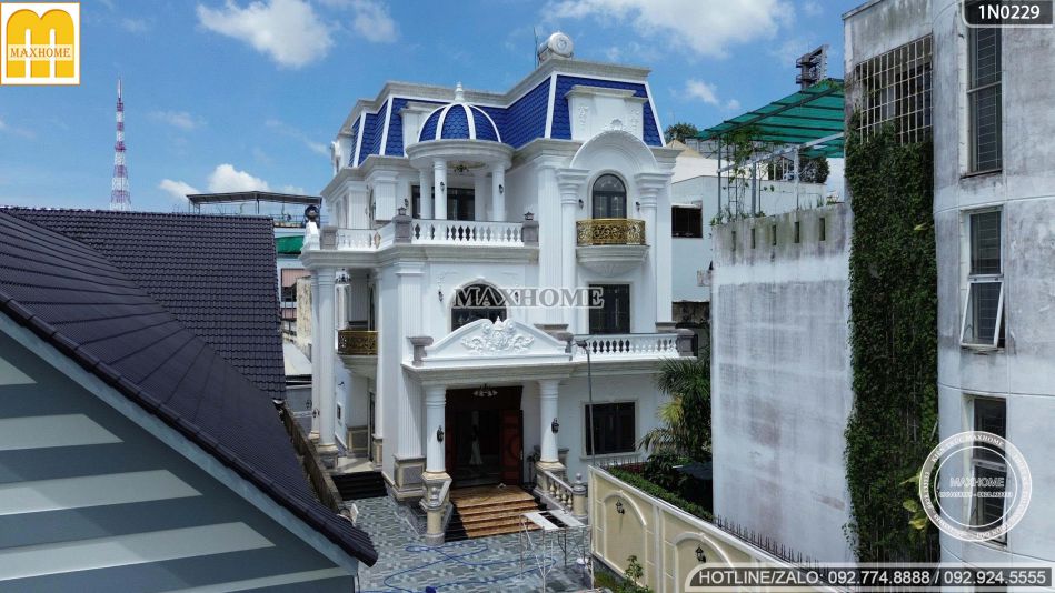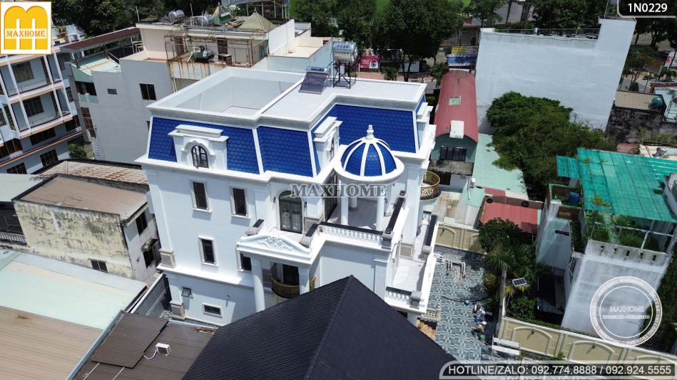 Công trình biệt thự 3 tầng mái Mansard được thiết kế với phần mái bề thế và uy nghi, thể hiện rõ đẳng cấp, gu thẩm mỹ và vị thế của gia chủ. Với tỷ lệ cân đối và kích thước đồ sộ, hệ mái Mansard có chiều cao gần tương đương một tầng nhà thông thường, giúp tổng thể công trình trở nên cao ráo, sang trọng và ấn tượng hơn. Bên cạnh yếu tố thẩm mỹ, loại mái này còn mang lại giá trị sử dụng thực tế, khi có thể tận dụng làm kho chứa hoặc phòng sinh hoạt bổ sung, đồng thời tăng khả năng chống nóng và chống thấm hiệu quả cho ngôi biệt thự.